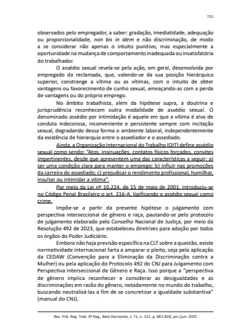 Rev. Trib. Reg. Trab. 3ª Reg., Belo Horizonte, v. 71, n. 111, p. 681-828, jan./jun. 2025715observados pelo empregador, a saber: gradação, imediatidade, adequação ou proporcionalidade, non bis in idem e não discriminação, de modo a se considerar não apenas o intuito punitivo, mas especialmente a oportunidade na mudança de comportamento inadequada ou insatisfatória do trabalhador.O assédio sexual revela-se pela ação, em geral, desenvolvida por empregado da reclamada, que, valendo-se da sua posição hierárquica superior, constrange a vítima ou as vítimas, com o intuito de obter vantagens ou favorecimento de cunho sexual, ameaçando-as com a perda de vantagens ou do próprio emprego.No âmbito trabalhista, além da hipótese supra, a doutrina e jurisprudência reconhecem outra modalidade de assédio sexual. O denominado assédio por intimidação é aquele em que a vítima é alvo de conduta indecorosa, inconveniente e persistente sempre com incitação sexual, degradando dessa forma o ambiente laboral, independentemente da existência de hierarquia entre o assediador e o assediado.Ainda, a Organização Internacional do Trabalho (OIT) define assédio sexual como sendo: “Atos, insinuações, contatos físicos forçados, convites impertinentes, desde que apresentem uma das características a seguir: a) ser uma condição clara para manter o emprego; b) influir nas promoções da carreira do assediado; c) prejudicar o rendimento profissional, humilhar, insultar ou intimidar a vítima”.Por meio da Lei nº 10.224, de 15 de maio de 2001, introduziu-se no Código Penal Brasileiro o art. 216-A, tipificando o assédio sexual como crime.Impõe-se a partir da presente hipótese o julgamento com perspectiva interseccional de gênero e raça, pautando-se pelo protocolo de julgamento elaborado pelo Conselho Nacional de Justiça, por meio da Resolução 492 de 2023, que estabeleceu diretrizes para adoção por todos os órgãos do Poder Judiciário.Embora não haja previsão específica na CLT sobre a questão, existe normatividade internacional farta a amparar o pleito, seja pela aplicação da CEDAW (Convenção para a Eliminação da Discriminação contra a Mulher) ou pela aplicação do Protocolo 492 do CNJ para Julgamento com Perspectiva Interseccional de Gênero e Raça. Isso porque a “perspectiva de gênero implica reconhecer e considerar as desigualdades e as discriminações em razão do gênero, notadamente no mundo do trabalho, buscando neutralizá-las a fim de se concretizar a igualdade substantiva” (manual do CNJ).