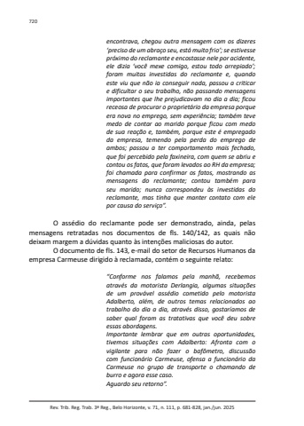 Rev. Trib. Reg. Trab. 3ª Reg., Belo Horizonte, v. 71, n. 111, p. 681-828, jan./jun. 2025720encontrava, chegou outra mensagem com os dizeres ‘preciso de um abraço seu, está muito frio’; se estivesse próximo do reclamante e encostasse nele por acidente, ele dizia ‘você mexe comigo, estou todo arrepiado’; foram muitas investidas do reclamante e, quando este viu que não ia conseguir nada, passou a criticar e dificultar o seu trabalho, não passando mensagens importantes que lhe prejudicavam no dia a dia; ficou receosa de procurar o proprietário da empresa porque era nova no emprego, sem experiência; também teve medo de contar ao marido porque ficou com medo de sua reação e, também, porque este é empregado da empresa, temendo pela perda do emprego de ambos; passou a ter comportamento mais fechado, que foi percebido pela faxineira, com quem se abriu e contou os fatos, que foram levados ao RH da empresa; foi chamada para confirmar os fatos, mostrando as mensagens do reclamante; contou também para seu marido; nunca correspondeu às investidas do reclamante, mas tinha que manter contato com ele por causa do serviço”.O assédio do reclamante pode ser demonstrado, ainda, pelas mensagens retratadas nos documentos de fls. 140/142, as quais não deixam margem a dúvidas quanto às intenções maliciosas do autor.O documento de fls. 143, e-mail do setor de Recursos Humanos da empresa Carmeuse dirigido à reclamada, contém o seguinte relato:“Conforme nos falamos pela manhã, recebemos através da motorista Derlangia, algumas situações de um provável assédio cometido pelo motorista Adalberto, além, de outros temas relacionados ao trabalho do dia a dia, através disso, gostaríamos de saber qual foram as tratativas que você deu sobre essas abordagens.Importante lembrar que em outras oportunidades, tivemos situações com Adalberto: Afronta com o vigilante para não fazer o bafômetro, discussão com funcionário Carmeuse, ofensa a funcionário da Carmeuse no grupo de transporte o chamando de burro e agora esse caso.Aguardo seu retorno”.