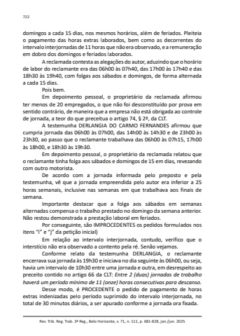 Rev. Trib. Reg. Trab. 3ª Reg., Belo Horizonte, v. 71, n. 111, p. 681-828, jan./jun. 2025722domingos a cada 15 dias, nos mesmos horários, além de feriados. Pleiteia o pagamento das horas extras laborados, bem como as decorrentes do intervalo interjornadas de 11 horas que não era observado, e a remuneração em dobro dos domingos e feriados laborados.A reclamada contesta as alegações do autor, aduzindo que o horário de labor do reclamante era das 06h00 às 07h40, das 17h00 às 17h40 e das 18h30 às 19h40, com folgas aos sábados e domingos, de forma alternada a cada 15 dias.Pois bem.Em depoimento pessoal, o proprietário da reclamada afirmou ter menos de 20 empregados, o que não foi desconstituído por prova em sentido contrário, de maneira que a empresa não está obrigada ao controle de jornada, a teor do que preceitua o artigo 74, § 2º, da CLT.A testemunha DERLANGIA DO CARMO FERNANDES afirmou que cumpria jornada das 06h00 às 07h00, das 14h00 às 14h30 e de 23h00 às 23h30, ao passo que o reclamante trabalhava das 06h00 às 07h15, 17h00 às 18h00, e 18h30 às 19h30.Em depoimento pessoal, o proprietário da reclamada relatou que o reclamante tinha folga aos sábados e domingos de 15 em dias, revezando com outro motorista.De acordo com a jornada informada pelo preposto e pela testemunha, vê que a jornada empreendida pelo autor era inferior a 25 horas semanais, inclusive nas semanas em que trabalhava aos finais de semana.Importante destacar que a folga aos sábados em semanas alternadas compensa o trabalho prestado no domingo da semana anterior. Não restou demonstrada a prestação laboral em feriados.Por conseguinte, são IMPROCEDENTES os pedidos formulados nos itens “i” e “j” da petição inicial)Em relação ao intervalo interjornada, contudo, verifico que o interstício não era observado a contento pela ré. Senão vejamos.Conforme relato da testemunha DERLANGIA, o reclamante encerrava sua jornada às 19h30 e iniciava no dia seguinte às 06h00, ou seja, havia um intervalo de 10h30 entre uma jornada e outra, em desrespeito ao preceito contido no artigo 66 da CLT: Entre 2 (duas) jornadas de trabalho haverá um período mínimo de 11 (onze) horas consecutivas para descanso.Desse modo, é PROCEDENTE o pedido de pagamento de horas extras indenizadas pelo período suprimido do intervalo interjornada, no total de 30 minutos diários, a ser apurado conforme a jornada ora fixada.