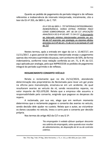 Rev. Trib. Reg. Trab. 3ª Reg., Belo Horizonte, v. 71, n. 111, p. 681-828, jan./jun. 2025723Quanto ao pedido de pagamento do período integral e de reflexos referentes a inobservância do intervalo interjornada, inicialmente, cito o teor da OJ nº 355, da SBDI-1, do C. TST:OJ nº 355 do SBDI-1 - TST INTERVALO INTERJORNADAS. INOBSERVÂNCIA. HORAS EXTRAS. PERÍODO PAGO COMO SOBREJORNADA. ART. 66 DA CLT. APLICAÇÃO ANALÓGICA DO § 4º DO ART. 71 DA CLT. O desrespeito ao intervalo mínimo interjornadas previsto no art. 66 da CLT acarreta, por analogia, os mesmos efeitos previstos no § 4º do art. 71 da CLT e na Súmula nº 110 do TST.Nestes termos, após a entrada em vigor da Lei n. 13.467/17, em 11/11/2017, o gozo parcial do intervalo interjornada enseja o pagamento apenas dos minutos suprimidos da pausa, com acréscimo de 50%, de forma indenizatória, conforme nova redação conferida ao art. 71, § 4º, da CLT, aqui aplicado por analogia, pelo que IMPROCEDE os pedidos de pagamento integral do período suprimido e de reflexos.RESSARCIMENTO CONSERTO VEÍCULORelata o reclamante que no dia 21/12/2023, atendendo determinação dos proprietários da Reclamada para levar um gol prata na oficina para manutenção, envolveu-se em um acidente, do qual resultaram avarias ao veículo da ré, sendo necessários reparos, no valor importe de R$1.870,00. Relata que a empresa não assumiu a responsabilidade pelo conserto, exigindo que pagasse as despesas do reparo.A reclamada, por sua vez, alega que em nenhum momento determinou que o reclamante pagasse o conserto das avarias no veículo, sendo decisão dele ajudar no custeio. Relata que o autor, ao vislumbrar os danos causados no veículo, levou o carro para o conserto por decisão própria.Nos termos do artigo 462 da CLT e seu § 1º:“Ao empregador é vedado efetuar qualquer desconto nos salários do empregado, salvo quando esse resultar de adiantamentos, de disposição de lei ou de contrato coletivo.