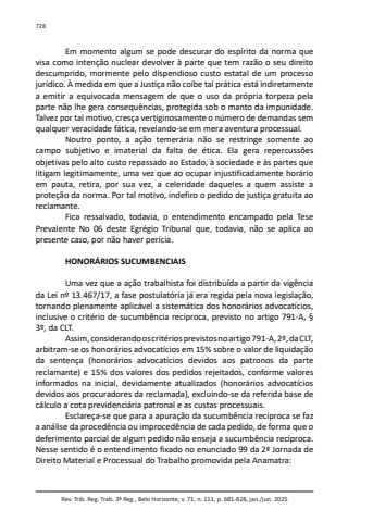 Rev. Trib. Reg. Trab. 3ª Reg., Belo Horizonte, v. 71, n. 111, p. 681-828, jan./jun. 2025728Em momento algum se pode descurar do espírito da norma que visa como intenção nuclear devolver à parte que tem razão o seu direito descumprido, mormente pelo dispendioso custo estatal de um processo jurídico. À medida em que a Justiça não coíbe tal prática está indiretamente a emitir a equivocada mensagem de que o uso da própria torpeza pela parte não lhe gera consequências, protegida sob o manto da impunidade. Talvez por tal motivo, cresça vertiginosamente o número de demandas sem qualquer veracidade fática, revelando-se em mera aventura processual.Noutro ponto, a ação temerária não se restringe somente ao campo subjetivo e imaterial da falta de ética. Ela gera repercussões objetivas pelo alto custo repassado ao Estado, à sociedade e às partes que litigam legitimamente, uma vez que ao ocupar injustificadamente horário em pauta, retira, por sua vez, a celeridade daqueles a quem assiste a proteção da norma. Por tal motivo, indefiro o pedido de justiça gratuita ao reclamante.Fica ressalvado, todavia, o entendimento encampado pela Tese Prevalente No 06 deste Egrégio Tribunal que, todavia, não se aplica ao presente caso, por não haver perícia.HONORÁRIOS SUCUMBENCIAISUma vez que a ação trabalhista foi distribuída a partir da vigência da Lei nº 13.467/17, a fase postulatória já era regida pela nova legislação, tornando plenamente aplicável a sistemática dos honorários advocatícios, inclusive o critério de sucumbência recíproca, previsto no artigo 791-A, § 3º, da CLT.Assim, considerando os critérios previstos no artigo 791-A, 2º, da CLT, arbitram-se os honorários advocatícios em 15% sobre o valor de liquidação da sentença (honorários advocatícios devidos aos patronos da parte reclamante) e 15% dos valores dos pedidos rejeitados, conforme valores informados na inicial, devidamente atualizados (honorários advocatícios devidos aos procuradores da reclamada), excluindo-se da referida base de cálculo a cota previdenciária patronal e as custas processuais.Esclareça-se que para a apuração da sucumbência recíproca se faz a análise da procedência ou improcedência de cada pedido, de forma que o deferimento parcial de algum pedido não enseja a sucumbência recíproca. Nesse sentido é o entendimento fixado no enunciado 99 da 2ª Jornada de Direito Material e Processual do Trabalho promovida pela Anamatra: