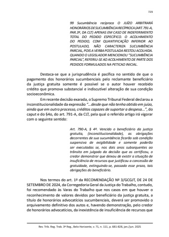 Rev. Trib. Reg. Trab. 3ª Reg., Belo Horizonte, v. 71, n. 111, p. 681-828, jan./jun. 202572999 Sucumbência recíproca O JUÍZO ARBITRARÁ HONORÁRIOS DE SUCUMBÊNCIA RECÍPROCA (ART. 791-A, PAR.3º, DA CLT) APENAS EM CASO DE INDEFERIMENTO TOTAL DO PEDIDO ESPECÍFICO. O ACOLHIMENTO DO PEDIDO, COM QUANTIFICAÇÃO INFERIOR AO POSTULADO, NÃO CARACTERIZA SUCUMBÊNCIA PARCIAL, POIS A VERBA POSTULADA RESTOU ACOLHIDA. QUANDO O LEGISLADOR MENCIONOU “SUCUMBÊNCIA PARCIAL”, REFERIU-SE AO ACOLHIMENTO DE PARTE DOS PEDIDOS FORMULADOS NA PETICAO INICIAL.Destaca-se que a jurisprudência é pacífica no sentido de que o pagamento dos honorários sucumbenciais pelo reclamante beneficiário da justiça gratuita somente é possível se o autor houver recebido crédito que promova substancial e indiscutível alteração de sua condição socioeconômica.Em recente decisão exarada, o Supremo Tribunal Federal declarou a inconstitucionalidade da expressão “…desde que não tenha obtido em juízo, ainda que em outro processo, créditos capazes de suportar a despesa...”, do caput e do §4o, do art. 791-A, da CLT, pela qual o referido artigo irá vigorar com o seguinte sentido:Art. 790-A, § 4º. Vencido o beneficiário da justiça gratuita, (inconstitucionalidade), as obrigações decorrentes de sua sucumbência ficarão sob condição suspensiva de exigibilidade e somente poderão ser executadas se, nos dois anos subsequentes ao trânsito em julgado da decisão que as certificou, o credor demonstrar que deixou de existir a situação de insuficiência de recursos que justificou a concessão de gratuidade, extinguindo-se, passado esse prazo, tais obrigações do beneficiário.Nos termos do art. 1º da RECOMENDAÇÃO Nº 3/GCGJT, DE 24 DE SETEMBRO DE 2024, da Corregedoria Geral da Justiça do Trabalho, contudo, foi recomendado às Varas do Trabalho que nos casos em que houver o reconhecimento de valores devidos por beneficiário da justiça gratuita, a título de honorários advocatícios sucumbenciais, deverá ser promovido o arquivamento definitivo dos autos e, havendo demonstração, pelo credor de honorários advocatícios, da inexistência de insuficiência de recursos que
