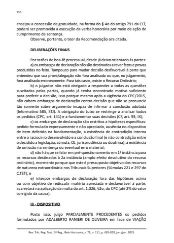 Rev. Trib. Reg. Trab. 3ª Reg., Belo Horizonte, v. 71, n. 111, p. 681-828, jan./jun. 2025730ensejou a concessão de gratuidade, na forma do § 4o do artigo 791 da CLT, poderá ser promovida a execução da verba honorária por meio de ação de cumprimento de sentença.Observe, portanto, o teor da Recomendação ora citada.DELIBERAÇÕES FINAISPor razões de boa-fé processual, desde já deixo orientado às partes:a) os embargos de declaração não são destinados a rever fatos e provas produzidas no feito. Tampouco para mudar decisão desfavorável à parte que entendeu que sua prova/alegação não fora analisada ou que, no julgamento, fora analisada erroneamente. Para tais casos, existe o Recurso Ordinário;b) o julgador não está obrigado a responder a todas as questões suscitadas pelas partes, quando já tenha encontrado motivo suficiente para proferir a decisão, isso porque mesmo após a vigência do CPC/2015, não cabem embargos de declaração contra decisão que não se pronuncie tão somente sobre argumento incapaz de infirmar a conclusão adotada (Informativo 585, STJ). A obrigação do Juízo se restringe a analisar todos os pedidos (CPC, art. 141) e a fundamentar suas decisões (CF, art. 93, IX);c) os embargos de declaração são restritos a hipóteses específicas: pedido formulado expressamente e não apreciado, ausência no dispositivo de item deferido na fundamentação, a existência de contradição interna entre o raciocínio desenvolvido e a conclusão final (e não contradição entre o decidido a legislação, súmula, OJ, jurisprudência ou doutrina), a existência de omissão na sentença ou eventual erro material;d) não há que se falar em pré-questionamento em 1ª instância para os recursos destinados à 2a instância (amplo efeito devolutivo do recurso ordinário), mormente porque que este é pressuposto objetivo dos recursos de natureza extraordinária nos Tribunais Superiores (Súmulas 221 e 297 do C.TST); ee) interpor embargos de declaração fora das hipóteses acima ou com objetivo de rediscutir matéria apreciada e desfavorável à parte, acarretará na aplicação da multa do art. 1.026, §2o, do CPC (até 2% do valor corrigido da causa).III - DISPOSITIVOPosto isso, julgo PARCIALMENTE PROCEDENTES os pedidos formulados por ADALBERTO RANIERI DE OLIVEIRA em face de VIAÇÃO