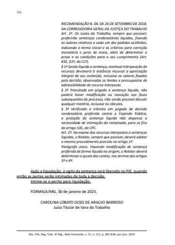 Rev. Trib. Reg. Trab. 3ª Reg., Belo Horizonte, v. 71, n. 111, p. 681-828, jan./jun. 2025732RECOMENDAÇÃO N. 04, DE 26 DE SETEMBRO DE 2018, DA CORREGEDORIA-GERAL DA JUSTIÇA DO TRABALHOArt. 1º. Os Juízes do Trabalho, sempre que possível, proferirão sentenças condenatórias líquidas, fixando os valores relativos a cada um dos pedidos acolhidos, indicando o termo inicial e os critérios para correção monetária e juros de mora, além de determinar o prazo e as condições para o seu cumprimento (Art. 832, §1º, da CLT).§ 1º Sendo líquida a sentença, eventual interposição de recursos devolverá à instância recursal a apreciação integral de seu conteúdo, inclusive os valores fixados pela decisão, observados os limites e pressupostos de admissibilidade do recurso interposto.§ 2º Transitada em julgado a sentença líquida, não poderá haver modificação ou inovação nas fases subsequentes do processo, não sendo possível discutir qualquer matéria, inclusive os cálculos.§ 3º Verificado o trânsito em julgado de decisão condenatória proferida contra a Fazenda Pública, a prolação de sentença líquida não dispensa a necessidade de intimação da reclamada, para os fins do artigo 535, do CPC.Art. 2º. No exame dos recursos interpostos a sentenças líquidas, o Relator, sempre que possível, deverá adotar o mesmo procedimento previsto no artigo 1º.Parágrafo único. Havendo modificação de sentença proferida de forma líquida na origem, o Relator deverá determinar o ajuste das contas, nos termos dos artigos 3º e 4º.Após a liquidação, o sigilo da sentença será liberado no PJE, quando então as partes serão intimadas de toda a decisão.Intime-se o perito para liquidação.FORMIGA/MG, 30 de janeiro de 2025.CAROLINA LOBATO GOES DE ARAÚJO BARROSOJuíza Titular de Vara do Trabalho