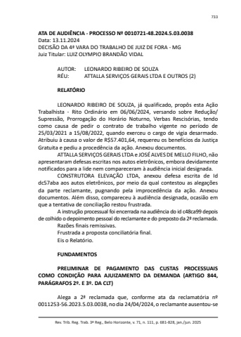 Rev. Trib. Reg. Trab. 3ª Reg., Belo Horizonte, v. 71, n. 111, p. 681-828, jan./jun. 2025733ATA DE AUDIÊNCIA - PROCESSO Nº 0010721-48.2024.5.03.0038Data: 13.11.2024DECISÃO DA 4ª VARA DO TRABALHO DE JUIZ DE FORA - MGJuiz Titular: LUIZ OLYMPIO BRANDÃO VIDALAUTOR: LEONARDO RIBEIRO DE SOUZARÉU: ATTALLA SERVIÇOS GERAIS LTDA E OUTROS (2)RELATÓRIOLEONARDO RIBEIRO DE SOUZA, já qualificado, propôs esta Ação Trabalhista - Rito Ordinário em 06/06/2024, versando sobre Redução/Supressão, Prorrogação do Horário Noturno, Verbas Rescisórias, tendo como causa de pedir o contrato de trabalho vigente no período de 25/03/2021 a 15/08/2022, quando exerceu o cargo de vigia desarmado. Atribuiu à causa o valor de R$57.401,64, requereu os benefícios da Justiça Gratuita e pediu a procedência da ação. Anexou documentos.ATTALLA SERVIÇOS GERAIS LTDA e JOSÉ ALVES DE MELLO FILHO, não apresentaram defesas escritas nos autos eletrônicos, embora devidamente notificados para a lide nem compareceram à audiência inicial designada.CONSTRUTORA ELEVAÇÃO LTDA, anexou defesa escrita de Id dc57aba aos autos eletrônicos, por meio da qual contestou as alegações da parte reclamante, pugnando pela improcedência da ação. Anexou documentos. Além disso, compareceu à audiência designada, ocasião em que a tentativa de conciliação restou frustrada.A instrução processual foi encerrada na audiência do id c48ca99 depois de colhido o depoimento pessoal do reclamante e do preposto da 2ª reclamada.Razões finais remissivas.Frustrada a proposta conciliatória final.Eis o Relatório.FUNDAMENTOSPRELIMINAR DE PAGAMENTO DAS CUSTAS PROCESSUAIS COMO CONDIÇÃO PARA AJUIZAMENTO DA DEMANDA (ARTIGO 844, PARÁGRAFOS 2º. E 3º. DA CLT)Alega a 2ª reclamada que, conforme ata da reclamatória nº 0011253-56.2023.5.03.0038, no dia 24/04/2024, o reclamante ausentou-se
