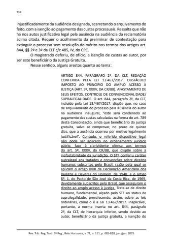 Rev. Trib. Reg. Trab. 3ª Reg., Belo Horizonte, v. 71, n. 111, p. 681-828, jan./jun. 2025734injustificadamente da audiência designada, acarretando o arquivamento do feito, com a isenção ao pagamento das custas processuais. Ressalta que não há nos autos justificativa legal pela ausência na audiência da reclamatória acima citada. Requer o acolhimento da preliminar de contestação para extinguir o processo sem resolução do mérito nos termos dos artigos art. 844, §§ 2º e 3º da CLT c/c 485, IV, do CPC.O magistrado deferiu, de ofício, a isenção de custas ao autor, por ser este beneficiário da Justiça Gratuita.Nesse sentido, alguns arestos quanto ao tema:ARTIGO 844, PARÁGRAFO 2º, DA CLT. REDAÇÃO CONFERIDA PELA LEI 13.467/2017. OBSTÁCULO IMPOSTO AO PRINCÍPIO DO AMPLO ACESSO À JUSTIÇA (ART. 5º, XXXV, DA CR/88). AFASTAMENTO DE SEUS EFEITOS. CONTROLE DE CONVENCIONALIDADE/SUPRALEGALIDADE. O art. 844, parágrafo 2º, da CLT, incluído pela Lei 13/467/2017, dispõe que, no caso de arquivamento do processo pela ausência do autor na audiência inaugural, “este será condenado ao pagamento das custas calculadas na forma do art. 789 desta Consolidação, ainda que beneficiário da justiça gratuita, salvo se comprovar, no prazo de quinze dias, que a ausência ocorreu por motivo legalmente justificável”. Contudo, o referido dispositivo legal não pode ser aplicado no ordenamento jurídico pátrio, face à clarividente ofensa aos termos do art. 5º, XXXV, da CR/88, que dispõe sobre a inafastabilidade da jurisdição. O STF conferiu cará ter supralegal aos tratados e convenções sobre direitos humanos subscritos pelo Brasil, razão pela qual se aplicam o artigo XVIII da Declaração Americana dos Direitos e Deveres do Homem, de 1948, e o artigo 8º, 1, do Pacto de São José da Costa Rica, de 1969, devidamente subscritos pelo Brasil, que asseguram o direito ao amplo acesso à justiça. Trata-se de direito humano, fundamental, alçado pelo STF ao status de supralegalidade, prevalecendo, assim, sobre as leis ordinárias, como o é a Lei 13.467/2017. Inaplicável, portanto, a norma inserta no art. 844, parágrafo 2º, da CLT, de hierarquia inferior, sendo devido ao autor, beneficiário da justiça gratuita, a isenção do