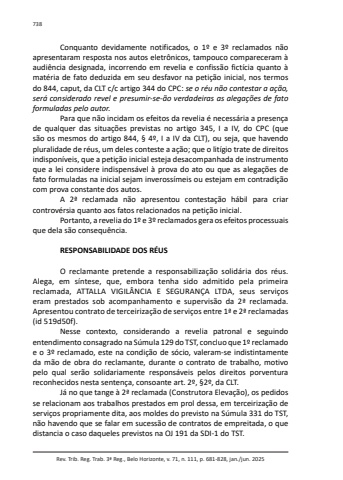 Rev. Trib. Reg. Trab. 3ª Reg., Belo Horizonte, v. 71, n. 111, p. 681-828, jan./jun. 2025738Conquanto devidamente notificados, o 1º e 3º reclamados não apresentaram resposta nos autos eletrônicos, tampouco compareceram à audiência designada, incorrendo em revelia e confissão fictícia quanto à matéria de fato deduzida em seu desfavor na petição inicial, nos termos do 844, caput, da CLT c/c artigo 344 do CPC: se o réu não contestar a ação, será considerado revel e presumir-se-ão verdadeiras as alegações de fato formuladas pelo autor.Para que não incidam os efeitos da revelia é necessária a presença de qualquer das situações previstas no artigo 345, I a IV, do CPC (que são os mesmos do artigo 844, § 4º, I a IV da CLT), ou seja, que havendo pluralidade de réus, um deles conteste a ação; que o litígio trate de direitos indisponíveis, que a petição inicial esteja desacompanhada de instrumento que a lei considere indispensável à prova do ato ou que as alegações de fato formuladas na inicial sejam inverossímeis ou estejam em contradição com prova constante dos autos.A 2ª reclamada não apresentou contestação hábil para criar controvérsia quanto aos fatos relacionados na petição inicial.Portanto, a revelia do 1º e 3º reclamados gera os efeitos processuais que dela são consequência.RESPONSABILIDADE DOS RÉUSO reclamante pretende a responsabilização solidária dos réus. Alega, em síntese, que, embora tenha sido admitido pela primeira reclamada, ATTALLA VIGILÂNCIA E SEGURANÇA LTDA, seus serviços eram prestados sob acompanhamento e supervisão da 2ª reclamada. Apresentou contrato de terceirização de serviços entre 1ª e 2ª reclamadas (id 519d50f).Nesse contexto, considerando a revelia patronal e seguindo entendimento consagrado na Súmula 129 do TST, concluo que 1º reclamado e o 3º reclamado, este na condição de sócio, valeram-se indistintamente da mão de obra do reclamante, durante o contrato de trabalho, motivo pelo qual serão solidariamente responsáveis pelos direitos porventura reconhecidos nesta sentença, consoante art. 2º, §2º, da CLT.Já no que tange à 2ª reclamada (Construtora Elevação), os pedidos se relacionam aos trabalhos prestados em prol dessa, em terceirização de serviços propriamente dita, aos moldes do previsto na Súmula 331 do TST, não havendo que se falar em sucessão de contratos de empreitada, o que distancia o caso daqueles previstos na OJ 191 da SDI-1 do TST.