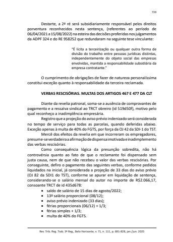 Rev. Trib. Reg. Trab. 3ª Reg., Belo Horizonte, v. 71, n. 111, p. 681-828, jan./jun. 2025739Destarte, a 2ª ré será subsidiariamente responsável pelos direitos porventura reconhecidos nesta sentença, (referentes ao período de 06/04/2021 a 15/08/2022) na esteira das decisões proferidas nos julgamentos da ADPF 324 e do RE 958252 que redundaram na seguinte tese vinculante:“É lícita a terceirização ou qualquer outra forma de divisão do trabalho entre pessoas jurídicas distintas, independentemente do objeto social das empresas envolvidas, mantida a responsabilidade subsidiária da empresa contratante.”O cumprimento de obrigações de fazer de natureza personalíssima constitui exceção quanto à responsabilidade da terceira reclamada.VERBAS RESCISÓRIAS. MULTAS DOS ARTIGOS 467 E 477 DA CLTDiante da revelia patronal, soma-se a ausência de comprovantes de pagamento e a ressalva sindical ao TRCT obreiro (id 519d50f), motivo pelo qual reconheço a inadimplência empresária.Registro que a projeção do aviso prévio indenizado será considerada no tempo de serviço para todas as parcelas, quando deferidas abaixo. Exceção apenas à multa de 40% do FGTS, por força da OJ 42 da SDI-1 do TST.Mercê dos efeitos da revelia em que incorreram os empregadores, presume-se verdadeira a afirmação de dispensa imotivada e inadimplemento das verbas rescisórias.Como consequência lógica da presunção sobredita, não há controvérsia quanto ao fato de que o reclamante foi dispensado sem justa causa, nem de que não recebeu o valor das verbas rescisórias. Por conseguinte, defiro o pagamento das seguintes verbas, conforme pedidos liquidados na inicial, já considerada a projeção de 33 dias do aviso prévio (OJ 82 da SDI1 do TST), conforme se apurar em liquidação de sentença, considerando-se o salário mensal do autor no importe de R$2.066,17, consoante TRCT de id 435d678: saldo de salário de 15 dias de agosto/2022; 13º salário proporcional (08/12); aviso prévio indenizado (33 dias); férias proporcionais (06/12) + 1/3; férias simples + 1/3; multa de 40% do FGTS.