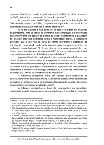 74Rev. Trib. Reg. Trab. 3ª Reg., Belo Horizonte, v. 71, n. 111, p. 61-94, jan./jun. 2025processo eletrônico, trazido a partir da Lei nº 11.419, de 19 de dezembro de 2006, intensifica o postulado da duração razoável47.O chamado Juízo 100% Digital, ecoado a partir da Resolução 345 CNJ, de 9 de outubro de 2020, rompe com o dogma de concretização das audiências, exclusivamente sob a forma presencial48.O Poder Judiciário não pode se colocar à margem da mudança de paradigma, mas se servir, ao contrário, das tecnologias de informação para incremento do acesso ao direito de ação, incentivando a passagem do clássico processo analógico rumo à tramitação digital. É necessário perceber que o PJe não se trata de forma meramente eletrônica de tramitação processual, dada pela transposição do processo físico ao ambiente computacional, “[...] mas sim de uma nova ferramenta, com novos procedimentos e nova racionalidade”, promovendo inclusão social, com mais transparência, efetividade e acessibilidade49.A possibilidade da condução dos atos processuais a distância, com oitiva de partes, testemunhas e advogados de modo remoto, promove verdadeira onda de democratização e acesso a uma ordem justa. O itinerário da informatização processual incrementa o postulado de razoabilidade, celeridade e eficiência na entrega prestacional, a partir da hermenêutica do artigo 5º, LXXVIII, da Constituição da República50.A dinâmica processual deve ser voltada para superação de obstáculos formais ao jurisdicionado. As ondas de acesso, como a gratuidade de justiça, a tutela coletiva e os métodos adequados de solução, devem ser construídas em prol da efetividade social51.A internet ressignifica a base de informações da sociedade, construída a partir dos caminhos comunicacionais. O uso das ferramentas 47 BRASIL. Lei nº 11.419, de 19 de dezembro de 2006. Dispõe sobre a informatização do processo judicial; altera a Lei nº 5.869, de 11 de janeiro de 1973 - Código de Processo Civil; e dá outras providências. Disponível em: www.planalto.gov.br. Acesso em: 03 jul. 2024. 48 CNJ. Conselho Nacional de Justiça. Resolução 345, de 9 de outubro de 2020. Dispõe sobre o “Juízo 100% Digital” e dá outras providências. Disponível em: www.cnj.jus.br. Acesso em: 27 jul. 2024. 49 SCHWARZ, Rodrigo Garcia. A justiça analógica rumo ao processo digital: a pejotaeização da prestação jurisdicional trabalhista. Revista da Associação dos Magistrados da Justiça do Trabalho da 15ª Região - Amatra XV, Campinas, n. 6, 2013, p. 66-67. 50 BRASIL. Constituição da República Federativa do Brasil de 1988. Disponível em: www.planalto.gov.br. Acesso em: 08 jul. 2024. 51 CAPPELLETTI, Mauro; GARTH, Bryant. Acesso à justiça. Trad. Ellen Gracie Northfleet. Porto Alegre: Fabris, 1988, p. 15.