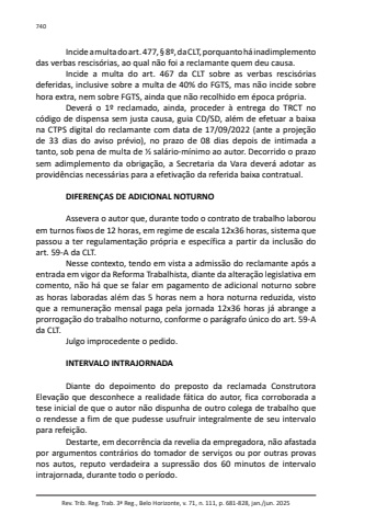 Rev. Trib. Reg. Trab. 3ª Reg., Belo Horizonte, v. 71, n. 111, p. 681-828, jan./jun. 2025740Incide a multa do art. 477, § 8º, da CLT, porquanto há inadimplemento das verbas rescisórias, ao qual não foi a reclamante quem deu causa.Incide a multa do art. 467 da CLT sobre as verbas rescisórias deferidas, inclusive sobre a multa de 40% do FGTS, mas não incide sobre hora extra, nem sobre FGTS, ainda que não recolhido em época própria.Deverá o 1º reclamado, ainda, proceder à entrega do TRCT no código de dispensa sem justa causa, guia CD/SD, além de efetuar a baixa na CTPS digital do reclamante com data de 17/09/2022 (ante a projeção de 33 dias do aviso prévio), no prazo de 08 dias depois de intimada a tanto, sob pena de multa de ½ salário-mínimo ao autor. Decorrido o prazo sem adimplemento da obrigação, a Secretaria da Vara deverá adotar as providências necessárias para a efetivação da referida baixa contratual.DIFERENÇAS DE ADICIONAL NOTURNOAssevera o autor que, durante todo o contrato de trabalho laborou em turnos fixos de 12 horas, em regime de escala 12x36 horas, sistema que passou a ter regulamentação própria e específica a partir da inclusão do art. 59-A da CLT.Nesse contexto, tendo em vista a admissão do reclamante após a entrada em vigor da Reforma Trabalhista, diante da alteração legislativa em comento, não há que se falar em pagamento de adicional noturno sobre as horas laboradas além das 5 horas nem a hora noturna reduzida, visto que a remuneração mensal paga pela jornada 12x36 horas já abrange a prorrogação do trabalho noturno, conforme o parágrafo único do art. 59-A da CLT.Julgo improcedente o pedido.INTERVALO INTRAJORNADADiante do depoimento do preposto da reclamada Construtora Elevação que desconhece a realidade fática do autor, fica corroborada a tese inicial de que o autor não dispunha de outro colega de trabalho que o rendesse a fim de que pudesse usufruir integralmente de seu intervalo para refeição.Destarte, em decorrência da revelia da empregadora, não afastada por argumentos contrários do tomador de serviços ou por outras provas nos autos, reputo verdadeira a supressão dos 60 minutos de intervalo intrajornada, durante todo o período.