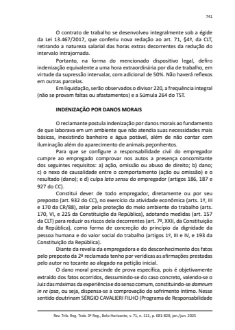 Rev. Trib. Reg. Trab. 3ª Reg., Belo Horizonte, v. 71, n. 111, p. 681-828, jan./jun. 2025741O contrato de trabalho se desenvolveu integralmente sob a égide da Lei 13.467/2017, que conferiu nova redação ao art. 71, §4º, da CLT, retirando a natureza salarial das horas extras decorrentes da redução do intervalo intrajornada.Portanto, na forma do mencionado dispositivo legal, defiro indenização equivalente a uma hora extraordinária por dia de trabalho, em virtude da supressão intervalar, com adicional de 50%. Não haverá reflexos em outras parcelas.Em liquidação, serão observados o divisor 220, a frequência integral (não se provam faltas ou afastamentos) e a Súmula 264 do TST.INDENIZAÇÃO POR DANOS MORAISO reclamante postula indenização por danos morais ao fundamento de que laborava em um ambiente que não atendia suas necessidades mais básicas, inexistindo banheiro e água potável, além de não contar com iluminação além do aparecimento de animais peçonhentos.Para que se configure a responsabilidade civil do empregador cumpre ao empregado comprovar nos autos a presença concomitante dos seguintes requisitos: a) ação, omissão ou abuso de direito; b) dano; c) o nexo de causalidade entre o comportamento (ação ou omissão) e o resultado (dano); e d) culpa lato sensu do empregador (artigos 186, 187 e 927 do CC).Constitui dever de todo empregador, diretamente ou por seu preposto (art. 932 do CC), no exercício da atividade econômica (arts. 1º, III e 170 da CR/88), zelar pela proteção do meio ambiente do trabalho (arts. 170, VI, e 225 da Constituição da República), adotando medidas (art. 157 da CLT) para reduzir os riscos dela decorrentes (art. 7º, XXII, da Constituição da República), como forma de concreção do princípio da dignidade da pessoa humana e do valor social do trabalho (artigos 1º, III e IV, e 193 da Constituição da República).Diante da revelia da empregadora e do desconhecimento dos fatos pelo preposto da 2ª reclamada tenho por verídicas as afirmações prestadas pelo autor no tocante ao alegado na petição inicial.O dano moral prescinde de prova específica, pois é objetivamente extraído dos fatos ocorridos, dessumindo-se do caso concreto, valendo-se o Juiz das máximas da experiência e do senso comum, constituindo-se damnum in re ipsa, ou seja, dispensa-se a comprovação do sofrimento íntimo. Nesse sentido doutrinam SÉRGIO CAVALIERI FILHO (Programa de Responsabilidade