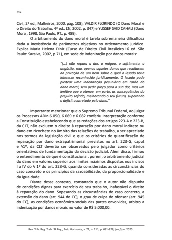 Rev. Trib. Reg. Trab. 3ª Reg., Belo Horizonte, v. 71, n. 111, p. 681-828, jan./jun. 2025742Civil, 2ª ed., Malheiros, 2000, pág. 108), VALDIR FLORINDO (O Dano Moral e o Direito do Trabalho, 4ª ed., LTr, 2002, p. 347) e YUSSEF SAID CAHALI (Dano Moral, 1998, São Paulo, RT., p. 489).O arbitramento do dano moral é tarefa sobremaneira dificultosa dada a inexistência de parâmetros objetivos no ordenamento jurídico. Explica Maria Helena Diniz (Curso de Direito Civil Brasileiro.16 ed. São Paulo: Saraiva, 2002, p.71), em sede de indenização por danos morais:“(...) não repara a dor, a mágoa, o sofrimento, a angústia, mas apenas aqueles danos que resultarem da privação de um bem sobre o qual o lesado teria interesse reconhecido juridicamente. O lesado pode pleitear uma indenização pecuniária em razão do dano moral, sem pedir preço para a sua dor, mas um lenitivo que a atenue, em parte, as consequências do prejuízo sofrido, melhorando o seu futuro, superando o deficit acarretado pelo dano.”Importante mencionar que o Supremo Tribunal Federal, ao julgar os Processos ADIn 6.050, 6.069 e 6.082 conferiu interpretação conforme a Constituição estabelecendo que as redações dos artigos 223-A e 223-B, da CLT, não excluem o direito à reparação por dano moral indireto ou dano em ricochete no âmbito das relações de trabalho, a ser apreciado nos termos da legislação civil e que os critérios de quantificação de reparação por dano extrapatrimonial previstos no art. 223-G, caput e §1º, da CLT deverão ser observados pelo julgador como critérios orientativos de fundamentação da decisão judicial. Além disso, firmou o entendimento de que é constitucional, porém, o arbitramento judicial do dano em valores superior aos limites máximos dispostos nos incisos I a IV do § 1º do art. 223-G, quando consideradas as circunstâncias do caso concreto e os princípios da razoabilidade, da proporcionalidade e da igualdade.Diante desse contexto, constatado que o autor não dispunha de condições dignas para exercício de seu trabalho, inafastável o direito à reparação do dano. Sopesando as circunstâncias do caso concreto, a extensão do dano (art. 944 do CC), o grau de culpa do ofensor (art. 945 do CC), as condições econômico-sociais das partes envolvidas, arbitro a indenização por danos morais no valor de R$ 5.000,00.