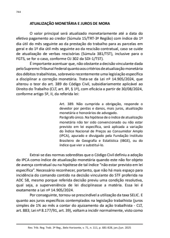 Rev. Trib. Reg. Trab. 3ª Reg., Belo Horizonte, v. 71, n. 111, p. 681-828, jan./jun. 2025744ATUALIZAÇÃO MONETÁRIA E JUROS DE MORAO valor principal será atualizado monetariamente até a data do efetivo pagamento ao credor (Súmula 15/TRT-3ª Região) com índice do 1º dia útil do mês seguinte ao da prestação do trabalho para as parcelas em geral e do 1º dia útil mês seguinte ao da rescisão contratual, caso se cuide de atualização de verbas rescisórias (Súmula 381/TST), inclusive para o FGTS, se for o caso, conforme OJ 302 da SDI-1/TST).É importante acentuar que, não obstante a decisão vinculante dada pelo Supremo Tribunal Federal quanto aos critérios de atualização monetária dos débitos trabalhistas, sobreveio recentemente uma legislação específica a disciplinar a correção monetária. Trata-se da Lei nº 14.905/2024, que alterou o teor do art. 389 do Código Civil, subsidiariamente aplicável ao Direito do Trabalho (CLT, art. 8º, § 1º), com eficácia a partir de 30/08/2024, conforme artigo 5º, II, da referida lei:Art. 389. Não cumprida a obrigação, responde o devedor por perdas e danos, mais juros, atualização monetária e honorários de advogado.Parágrafo único. Na hipótese de o índice de atualização monetária não ter sido convencionado ou não estar previsto em lei específica, será aplicada a variação do Índice Nacional de Preços ao Consumidor Amplo (IPCA), apurado e divulgado pela Fundação Instituto Brasileiro de Geografia e Estatística (IBGE), ou do índice que vier a substituí-lo.Extrai-se das normas sobreditas que o Código Civil definiu a adoção do IPCA como índice de atualização monetária quando este não for objeto de avença contratual ou na hipótese de tal índice “não estar previsto em lei específica”. Necessário reconhecer, portanto, que não há mais espaço para incidência do comando contido na decisão vinculante do STF proferida na ADC 58, mesmo porque referida decisão previu uma condição resolutiva, qual seja, a superveniência de lei disciplinasse a matéria. Essa lei é exatamente a Lei nº 14.905/2024.Por conseguinte, tornou-se prescindível a utilização da taxa SELIC. E quanto aos juros específicos contemplados na legislação trabalhista (juros simples de 1% ao mês a contar do ajuizamento da ação trabalhista - CLT, art. 883; Lei nº 8.177/91, art. 39), voltam a incidir normalmente, visto como