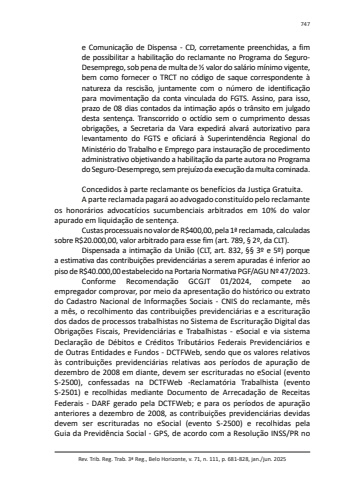 Rev. Trib. Reg. Trab. 3ª Reg., Belo Horizonte, v. 71, n. 111, p. 681-828, jan./jun. 2025747e Comunicação de Dispensa - CD, corretamente preenchidas, a fim de possibilitar a habilitação do reclamante no Programa do SeguroDesemprego, sob pena de multa de ½ valor do salário mínimo vigente, bem como fornecer o TRCT no código de saque correspondente à natureza da rescisão, juntamente com o número de identificação para movimentação da conta vinculada do FGTS. Assino, para isso, prazo de 08 dias contados da intimação após o trânsito em julgado desta sentença. Transcorrido o octídio sem o cumprimento dessas obrigações, a Secretaria da Vara expedirá alvará autorizativo para levantamento do FGTS e oficiará à Superintendência Regional do Ministério do Trabalho e Emprego para instauração de procedimento administrativo objetivando a habilitação da parte autora no Programa do Seguro-Desemprego, sem prejuízo da execução da multa cominada.Concedidos à parte reclamante os benefícios da Justiça Gratuita.A parte reclamada pagará ao advogado constituído pelo reclamante os honorários advocatícios sucumbenciais arbitrados em 10% do valor apurado em liquidação de sentença.Custas processuais no valor de R$400,00, pela 1ª reclamada, calculadas sobre R$20.000,00, valor arbitrado para esse fim (art. 789, § 2º, da CLT).Dispensada a intimação da União (CLT, art. 832, §§ 3º e 5º) porque a estimativa das contribuições previdenciárias a serem apuradas é inferior ao piso de R$40.000,00 estabelecido na Portaria Normativa PGF/AGU Nº 47/2023.Conforme Recomendação GCGJT 01/2024, compete ao empregador comprovar, por meio da apresentação do histórico ou extrato do Cadastro Nacional de Informações Sociais - CNIS do reclamante, mês a mês, o recolhimento das contribuições previdenciárias e a escrituração dos dados de processos trabalhistas no Sistema de Escrituração Digital das Obrigações Fiscais, Previdenciárias e Trabalhistas - eSocial e via sistema Declaração de Débitos e Créditos Tributários Federais Previdenciários e de Outras Entidades e Fundos - DCTFWeb, sendo que os valores relativos às contribuições previdenciárias relativas aos períodos de apuração de dezembro de 2008 em diante, devem ser escrituradas no eSocial (evento S-2500), confessadas na DCTFWeb -Reclamatória Trabalhista (evento S-2501) e recolhidas mediante Documento de Arrecadação de Receitas Federais - DARF gerado pela DCTFWeb; e para os períodos de apuração anteriores a dezembro de 2008, as contribuições previdenciárias devidas devem ser escrituradas no eSocial (evento S-2500) e recolhidas pela Guia da Previdência Social - GPS, de acordo com a Resolução INSS/PR no