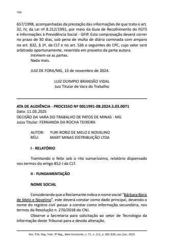 Rev. Trib. Reg. Trab. 3ª Reg., Belo Horizonte, v. 71, n. 111, p. 681-828, jan./jun. 2025748657/1998, acompanhadas da prestação das informações de que trata o art. 32, IV, da Lei nº 8.212/1991, por meio da Guia de Recolhimento do FGTS e Informações à Previdência Social - GFIP. Esta comprovação deverá correr no prazo de 30 dias, sob pena de multa de diária cominada com amparo no art. 832, § 1º, da CLT e no art. 536 e seguintes do CPC, cujo valor será arbitrado oportunamente, revertida em proveito da parte autora.Intimem-se as partes.Nada mais.JUIZ DE FORA/MG, 13 de novembro de 2024.LUIZ OLYMPIO BRANDÃO VIDALJuiz Titular de Vara do TrabalhoATA DE AUDIÊNCIA - PROCESSO Nº 0011991-08.2024.5.03.0071Data: 11.03.2025DECISÃO DA VARA DO TRABALHO DE PATOS DE MINAS - MGJuíza Titular: FERNANDA DA ROCHA TEIXEIRAAUTOR: YURI RORIZ DE MELO E NOVELINORÉU: MART MINAS DISTRIBUIÇÃO LTDAI - RELATÓRIOTramitando o feito sob o rito sumaríssimo, relatório dispensado nos termos do artigo 852-I da CLT.II - FUNDAMENTAÇÃONOME SOCIALConsiderando que a Reclamante indica o nome social “Bárbara Roriz de Melo e Novelino”, este deverá constar como dado principal, devendo o nome do registro civil passar a constar como informação secundária, nos termos da Resolução n. 270/2018 do CNJ.Observe a Secretaria para solicitação ao setor de Tecnologia da Informação deste Tribunal para a devida alteração.