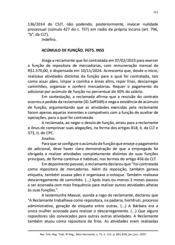 Rev. Trib. Reg. Trab. 3ª Reg., Belo Horizonte, v. 71, n. 111, p. 681-828, jan./jun. 2025751136/2014 do CSJT, não podendo, posteriormente, invocar nulidade processual (súmula 427 do c. TST) em razão da própria incúria (art. 796, “b”, da CLT).Indefiro.ACÚMULO DE FUNÇÃO. FGTS. INSSAlega a reclamante que foi contratada em 07/02/2023 para exercer a função de repositora de mercadorias, com remuneração mensal de R$1.570,00, e dispensada em 10/11/2024. Acrescenta que, desde o início, realizava atividades distintas da função para a qual foi contratada, tais como assar pães, limpar a cozinha e áreas afins, repor frios, descarregar caminhões, organizar e conferir mercadorias. Requer o pagamento do adicional por acúmulo de função no percentual de 30% do salário.Em contestação, a reclamada afirma que a rescisão do contrato ocorreu a pedido da reclamante (ID.5aff3d9) e nega a existência de acúmulo de função, argumentando que as atividades exercidas pela reclamante foram apenas aquelas inerentes e compatíveis com a função de auxiliar de operações, para a qual foi contratada.A reclamada, ao negar o desvio de função, atraiu para a reclamante o ônus de comprovar suas alegações, na forma dos artigos 818, II, da CLT e 373, II, do CPC.Analiso.Para que se configure o acúmulo de função que enseje o pagamento de adicional, deve haver clara demonstração de que a empregada foi obrigada a realizar atividades completamente distintas de suas funções principais, de forma contínua e habitual, nos termos do artigo 456 da CLT.Em depoimento pessoal, a reclamante declarou que “Foi contratada como repositora de mercadorias. Além da reposição, também gerava etiqueta, também assava pães e organizava o estoque. Também realizava descarregamento de caminhão. (...) Após mais ou menos 3 meses passou a ser acionada com mais frequência para realizar outras atividades alheias às suas funções.”.A testemunha Maxuel, ouvida a rogo da reclamante, declarou que “A Reclamante trabalhava como repositora, na padaria, hortifruti, processo administrativo, geração de etiqueta entre outras. (...) A Bárbara era a única mulher acionada para realizar o descarregamento. (...) Que alguns repositores são convocados para outras outras atividades. A Reclamante também atuou como repositora de frios. As atividades eram realizadas