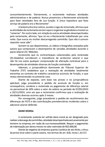 Rev. Trib. Reg. Trab. 3ª Reg., Belo Horizonte, v. 71, n. 111, p. 681-828, jan./jun. 2025752concomitantemente. Diariamente, a reclamante realizava atividades administrativas e de padaria. Nunca presenciou a Reclamante solicitando para fazer atividades fora de sua função. A única repositora que fazia serviço de padaria era a Reclamante”.A testemunha Ana Letícia, ouvida a rogo da reclamada, afirmou que as atividades da reclamante seriam repor e organizar as gôndolas e montar as “caixarias”. Por outro lado, em relação às outras atividades desempenhadas pela reclamante, afirmou “que só viu a Reclamante trabalhando por uma noite. Que nunca viu mulher descarregando caminhão. Que não é comum repositor assar pão”.Somam-se aos depoimentos, os vídeos e fotografias anexados pela autora que comprovam o desempenho de variadas atividades durante o pacto laboral (ID. 9febc6e).Acrescento que os contracheques colacionados pela reclamada (ID.1bede5a) corroboram a inexistência de acréscimo salarial e que não há nos autos qualquer comprovação de alteração contratual para o desempenho de atividades diversas da função contratada.Ademais, a jurisprudência dominante do Tribunal Superior do Trabalho (TST) estabelece que a realização de atividades totalmente estranhas ao contrato de trabalho caracteriza acúmulo de função, o que restou demonstrado no presente caso.Diante do exposto, com base nas provas e na jurisprudência aplicável, julgo procedente o pedido de acúmulo de função e, em consequência, condeno a reclamada ao pagamento de diferença salarial no percentual de 30% sobre o valor do salário no período de 07/05/2023 a 10/11/2024, uma vez que a reclamante confirmou que a realização de atividades diversas ocorreu após 3 meses.Por conseguinte, julgo procedente o pedido de recolhimento das diferenças do FGTS e das contribuições previdenciárias incidentes sobre o adicional salarial deferido.DANO MORALA reclamante sustenta ter sofrido dano moral ao ser designada para realizar a descarga de caminhões, atividade desempenhada exclusivamente por homens na empresa, em razão de sua transexualidade. Requer o pagamento de indenização por danos morais no valor estimado de R$5.000,00.Diante da negativa da empresa quanto à prática de ato ilícito, o ônus da prova recai sobre a parte autora, nos termos do art. 818, inciso I, da CLT.