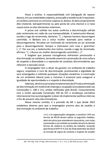 Rev. Trib. Reg. Trab. 3ª Reg., Belo Horizonte, v. 71, n. 111, p. 681-828, jan./jun. 2025753Passo à análise. A responsabilidade civil (obrigação de reparar danos), em sua modalidade subjetiva, pressupõe a existência de 3 requisitos: a) conduta comissiva ou omissiva culposa ou dolosa, b) dano propriamente dito (material, extrapatrimonial ou pela perda de uma chance) e c) nexo causal entre os dois elementos anteriores.A prova oral colhida nos autos confirma a discriminação sofrida pela reclamante em razão de sua transexualidade. A testemunha Maxuel, ouvida a rogo da reclamante, declarou: “(...) Apenas homens descarregam caminhão. A Bárbara era a única mulher acionada para realizar o descarregamento. Percebia um incômodo da reclamante ao ser acionada para o descarregamento. Sempre a chamavam com risos e ‘gracinhas’ (...)”. Por sua vez, a testemunha Ana Letícia, ouvida a rogo da reclamada, afirmou: “(...) Nunca viu mulher descarregando caminhão (...)”.É inegável que pessoas transgêneras enfrentam preconceito e discriminação no cotidiano, tornando essencial a promoção de uma cultura de respeito à diversidade e a repressão de condutas discriminatórias que reforcem a exclusão social.O empregador tem o dever de garantir um ambiente de trabalho seguro, respeitoso e livre de discriminação, promovendo a dignidade de seus empregados e coibindo quaisquer situações vexatórias. A construção de um ambiente laboral justo e inclusivo é essencial para assegurar a igualdade de oportunidades e o respeito à diversidade.Ademais, dentre os princípios fundamentais da OIT está a eliminação da discriminação em matéria de emprego e ocupação (consubstanciado nas Convenções n. 100 e 111, ambas ratificados pelo Brasil). Conjuntamente com a recém aprovada Convenção 190 da OIT, o arcabouço normativo internacional traz ao empregador o dever de implementar políticas internas a fim de prevenir atos discriminatórios.Nesse mesmo sentido, é a previsão da NR 1 que desde 2022 estabelece deveres para que o empregador previna atos de assédio e discriminação no ambiente de trabalho:1.4.1.1 As organizações obrigadas a constituir CIPA nos termos da NR-05 devem adotar as seguintes medidas, além de outras que entenderem necessárias, com vistas à prevenção e ao combate ao assédio sexual e às demais formas de violência no âmbito do trabalho: (inserido pela Portaria MTP nº 4.219, de 20 de dezembro de 2022) a) inclusão de regras de conduta a respeito do assédio