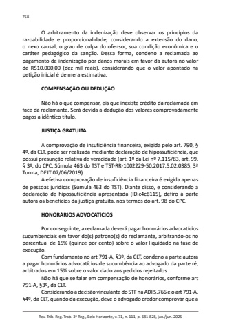 Rev. Trib. Reg. Trab. 3ª Reg., Belo Horizonte, v. 71, n. 111, p. 681-828, jan./jun. 2025758O arbitramento da indenização deve observar os princípios da razoabilidade e proporcionalidade, considerando a extensão do dano, o nexo causal, o grau de culpa do ofensor, sua condição econômica e o caráter pedagógico da sanção. Dessa forma, condeno a reclamada ao pagamento de indenização por danos morais em favor da autora no valor de R$10.000,00 (dez mil reais), considerando que o valor apontado na petição inicial é de mera estimativa.COMPENSAÇÃO OU DEDUÇÃONão há o que compensar, eis que inexiste crédito da reclamada em face da reclamante. Será devida a dedução dos valores comprovadamente pagos a idêntico título.JUSTIÇA GRATUITAA comprovação de insuficiência financeira, exigida pelo art. 790, § 4º, da CLT, pode ser realizada mediante declaração de hipossuficiência, que possui presunção relativa de veracidade (art. 1º da Lei nº 7.115/83, art. 99, § 3º, do CPC, Súmula 463 do TST e TST-RR-1002229-50.2017.5.02.0385, 3ª Turma, DEJT 07/06/2019).A efetiva comprovação de insuficiência financeira é exigida apenas de pessoas jurídicas (Súmula 463 do TST). Diante disso, e considerando a declaração de hipossuficiência apresentada (ID.c4c8115), defiro à parte autora os benefícios da justiça gratuita, nos termos do art. 98 do CPC.HONORÁRIOS ADVOCATÍCIOSPor conseguinte, a reclamada deverá pagar honorários advocatícios sucumbenciais em favor do(s) patrono(s) do reclamante, arbitrando-os no percentual de 15% (quinze por cento) sobre o valor liquidado na fase de execução.Com fundamento no art 791-A, §3º, da CLT, condeno a parte autora a pagar honorários advocatícios de sucumbência ao advogado da parte ré, arbitrados em 15% sobre o valor dado aos pedidos rejeitados.Não há que se falar em compensação de honorários, conforme art 791-A, §3º, da CLT.Considerando a decisão vinculante do STF na ADI 5.766 e o art 791-A, §4º, da CLT, quando da execução, deve o advogado credor comprovar que a