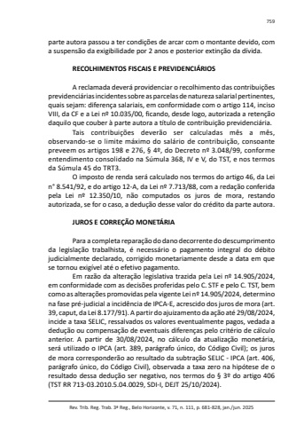 Rev. Trib. Reg. Trab. 3ª Reg., Belo Horizonte, v. 71, n. 111, p. 681-828, jan./jun. 2025759parte autora passou a ter condições de arcar com o montante devido, com a suspensão da exigibilidade por 2 anos e posterior extinção da dívida.RECOLHIMENTOS FISCAIS E PREVIDENCIÁRIOSA reclamada deverá providenciar o recolhimento das contribuições previdenciárias incidentes sobre as parcelas de natureza salarial pertinentes, quais sejam: diferença salariais, em conformidade com o artigo 114, inciso VIII, da CF e a Lei nº 10.035/00, ficando, desde logo, autorizada a retenção daquilo que couber à parte autora a título de contribuição previdenciária.Tais contribuições deverão ser calculadas mês a mês, observando-se o limite máximo do salário de contribuição, consoante preveem os artigos 198 e 276, § 4º, do Decreto nº 3.048/99, conforme entendimento consolidado na Súmula 368, IV e V, do TST, e nos termos da Súmula 45 do TRT3.O imposto de renda será calculado nos termos do artigo 46, da Lei n° 8.541/92, e do artigo 12-A, da Lei nº 7.713/88, com a redação conferida pela Lei nº 12.350/10, não computados os juros de mora, restando autorizada, se for o caso, a dedução desse valor do crédito da parte autora.JUROS E CORREÇÃO MONETÁRIAPara a completa reparação do dano decorrente do descumprimento da legislação trabalhista, é necessário o pagamento integral do débito judicialmente declarado, corrigido monetariamente desde a data em que se tornou exigível até o efetivo pagamento.Em razão da alteração legislativa trazida pela Lei nº 14.905/2024, em conformidade com as decisões proferidas pelo C. STF e pelo C. TST, bem como as alterações promovidas pela vigente Lei nº 14.905/2024, determino na fase pré-judicial a incidência de IPCA-E, acrescido dos juros de mora (art. 39, caput, da Lei 8.177/91). A partir do ajuizamento da ação até 29/08/2024, incide a taxa SELIC, ressalvados os valores eventualmente pagos, vedada a dedução ou compensação de eventuais diferenças pelo critério de cálculo anterior. A partir de 30/08/2024, no cálculo da atualização monetária, será utilizado o IPCA (art. 389, parágrafo único, do Código Civil); os juros de mora corresponderão ao resultado da subtração SELIC - IPCA (art. 406, parágrafo único, do Código Civil), observada a taxa zero na hipótese de o resultado dessa dedução ser negativo, nos termos do § 3º do artigo 406 (TST RR 713-03.2010.5.04.0029, SDI-I, DEJT 25/10/2024).
