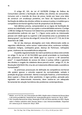 76Rev. Trib. Reg. Trab. 3ª Reg., Belo Horizonte, v. 71, n. 111, p. 61-94, jan./jun. 2025O artigo 6º, VIII, da Lei nº 8.078/90 (Código de Defesa do Consumidor) admite a facilitação da defesa dos direitos do consumidor, inclusive com a inversão do ônus da prova, tendo por base uma ideia de construir um arcabouço protetivo, em favor do hipossuficiente. A facilitação da defesa dos direitos reflete no acesso à justiça, à medida que a competência territorial significa local de propositura da demanda.Sob idêntico prisma, compreendem-se as regras de facilitação do acesso ao trabalhador senil e ao sujeito a vulnerabilidade extrema. O artigo 1.048 do Código de Processo Civil determina prioridade de tramitação nos procedimentos judiciais em que “[...] figure como parte ou interessado pessoa com idade igual ou superior a 60 (sessenta) anos ou portadora de doença grave”, nos termos do artigo 6º, inciso XIV, da Lei nº 7.713, de 22 de dezembro de 1988.No rol das doenças abrangidas com trato diferenciado estão as seguintes referências, entre outras: tuberculose ativa, esclerose múltipla, neoplasia maligna, cardiopatia grave, doença de Parkinson, nefropatia grave, síndrome da imunodeficiência adquirida.O padrão regulamentador da matriz protetiva ao idoso está contido no artigo 71 da Lei nº 10.741/2003 que prevê prioridade na tramitação dos processos à pessoa com idade igual ou superior a 60 (sessenta) anos57. A especificidade do acesso do idoso à justiça reflete a garantia dos direitos e resgate da cidadania dessa parcela social - artigo 2º, VI, da Resolução 520/2023 CNJ, à luz de um tratamento diferenciado e assistência humanizada58.As premissas processuais de definição da competência territorial não podem ignorar o colorido especial da normatividade, voltado à proteção do grupo vulnerável. Atenta à evolução histórica, a hermenêutica deve superar a frieza do olhar positivista. A regra jurídica, pensada pelo legislador em determinado momento, deve revelar-se um adequado ferramental de solução harmônica dos problemas contemporâneos.57 BRASIL. Lei nº 10.741, de 1º de outubro de 2003. Dispõe sobre o Estatuto da Pessoa Idosa e dá outras providências. Disponível em: www.planalto.gov.br. Acesso em: 30 jul. 2024. 58 CNJ. Conselho Nacional de Justiça. Resolução nº 520, de 18 de setembro de 2023. Dispõe sobre a Política Judiciária sobre Pessoas Idosas e suas interseccionalidades. Disponível em: www.cnj.jus.br. Acesso em: 08 jul. 2024.