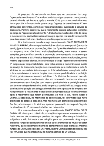 Rev. Trib. Reg. Trab. 3ª Reg., Belo Horizonte, v. 71, n. 111, p. 681-828, jan./jun. 2025764O preposto da reclamada explicou que os ocupantes do cargo “agente de atendimento II” eram funcionários antigos que exerciam a jornada de trabalho de seis horas e, após o ano de 2010, passaram a trabalhar oito horas por dia. Afirmou ainda que o cargo “agente de atendimento II” tem atribuições diferentes, com maior responsabilidade, auxiliando o serviço de tesouraria. Por fim, asseverou que o reclamante exercia as funções inerentes ao cargo de “agente de atendimento I”, trabalhando no atendimento do caixa, e nunca exerceu as atividades do outro cargo, apenas realizando treinamento para área comercial, mas não houve mudança para esse setor.Já a testemunha ouvida a rogo do reclamante, TALES BRENNER DE ALMEIDA RIBEIRO, afirmou que havia critérios técnicos e temporais (tempo de serviço) para alcançar as promoções, além das “questões de relacionamento” na empresa, mas não havia avaliações/feedbacks, nem metas a serem atingidas, para justificar ou não a promoção do empregado. Asseverou que ele, o reclamante e o Sr. Vinícius desempenhavam as mesmas funções, com a mesma capacidade técnica. Disse ainda que o cargo “agente de atendimento II” exigia maior responsabilidade, pois tinha acesso a numerários no auxílio ao serviço de tesouraria, função que era realizada pelo reclamante e pelo Sr. Vinícius, se necessário. Afirmou que os três trabalhavam na agência matriz e desempenhavam a mesma função, com mesma produtividade e perfeição técnica, podendo o reclamante substituir o Sr. Vinícius, bem como que não havia motivo para o reclamante não ser promovido, tendo em vista que desempenhava suas funções com mesma produtividade e perfeição técnica dos demais colegas de trabalho, a não ser por sua condição física. Alegou ainda que havia indignação dos colegas de trabalho com a postura da empresa em não promover o reclamante e citou outros empregados que foram admitidos após o reclamante que foram promovidos ao nível II, Srs. Pedro, Roger e Osimar. Alegou que, no momento da contratação, foi informado que havia promoção de cargos a cada ano, mas não havia um plano de cargos definido. Por fim, afirmou que o Sr. Vinícius, após ser promovido ao cargo de “agente de atendimento II” passou a trabalhar em outro setor.Já a testemunha ouvida a rogo da reclamada, MARCIO GERALDO DE CARVALHO, disse que o critério de promoção era por merecimento e que não havia nenhum documento que previsse tais regras. Afirmou que há critérios subjetivos e não há meta a ser atingida para ser promovido. Alegou que exerceu a função de caixa por cinco anos e só foi promovido ao mudar de setor. Asseverou que o reclamante ficava no atendimento e que exercia as mesmas funções da Sra Viviane e dos dos Srs. Pedro, Roger e Osimar, podendo substituí-los. Por fim, disse que não trabalhou na mesma agência do Sr. Vinícius.