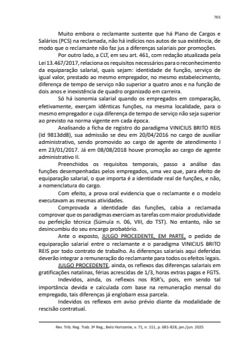 Rev. Trib. Reg. Trab. 3ª Reg., Belo Horizonte, v. 71, n. 111, p. 681-828, jan./jun. 2025765Muito embora o reclamante sustente que há Plano de Cargos e Salários (PCS) na reclamada, não há indícios nos autos de sua existência, de modo que o reclamante não faz jus a diferenças salariais por promoções.Por outro lado, a CLT, em seu art. 461, com redação atualizada pela Lei 13.467/2017, relaciona os requisitos necessários para o reconhecimento da equiparação salarial, quais sejam: identidade de função, serviço de igual valor, prestado ao mesmo empregador, no mesmo estabelecimento, diferença de tempo de serviço não superior a quatro anos e na função de dois anos e inexistência de quadro organizado em carreira.Só há isonomia salarial quando os empregados em comparação, efetivamente, exerçam idênticas funções, na mesma localidade, para o mesmo empregador e cuja diferença de tempo de serviço não seja superior ao previsto na norma vigente em cada época.Analisando a ficha de registro do paradigma VINICIUS BRITO REIS (Id 9813dd8), sua admissão se deu em 20/04/2016 no cargo de auxiliar administrativo, sendo promovido ao cargo de agente de atendimento I em 23/01/2017. Já em 08/08/2018 houve promoção ao cargo de agente administrativo II.Preenchidos os requisitos temporais, passo a análise das funções desempenhadas pelos empregados, uma vez que, para efeito de equiparação salarial, o que importa é a identidade real de funções, e não, a nomenclatura do cargo.Com efeito, a prova oral evidencia que o reclamante e o modelo executavam as mesmas atividades.Comprovada a identidade das funções, cabia a reclamada comprovar que os paradigmas exerciam as tarefas com maior produtividade ou perfeição técnica (Súmula n. 06, VIII, do TST). No entanto, não se desincumbiu do seu encargo probatório.Ante o exposto, JULGO PROCEDENTE, EM PARTE, o pedido de equiparação salarial entre o reclamante e o paradigma VINICIUS BRITO REIS por todo contrato de trabalho. As diferenças salariais aqui deferidas deverão integrar a remuneração do reclamante para todos os efeitos legais.JULGO PROCEDENTE, ainda, os reflexos das diferenças salariais em gratificações natalinas, férias acrescidas de 1/3, horas extras pagas e FGTS.Indevidos, ainda, os reflexos nos RSR’s, pois, em sendo tal importância devida e calculada com base na remuneração mensal do empregado, tais diferenças já englobam essa parcela.Indevidos os reflexos em aviso prévio diante da modalidade de rescisão contratual.