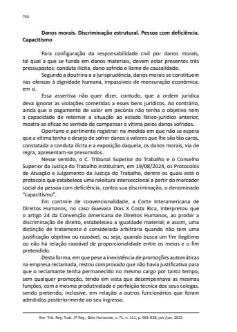 Rev. Trib. Reg. Trab. 3ª Reg., Belo Horizonte, v. 71, n. 111, p. 681-828, jan./jun. 2025766Danos morais. Discriminação estrutural. Pessoa com deficiência. CapacitismoPara configuração da responsabilidade civil por danos morais, tal qual a que se funda em danos materiais, devem estar presentes três pressupostos: conduta ilícita, dano sofrido e liame de causalidade.Segundo a doutrina e a jurisprudência, danos morais se constituem nas ofensas à dignidade humana, impassíveis de mensuração econômica, em si.Essa assertiva não quer dizer, contudo, que a ordem jurídica deva ignorar as violações cometidas a esses bens jurídicos. Ao contrário, ainda que o pagamento de valor em pecúnia não tenha o objetivo nem a capacidade de retornar a situação ao estado fático-jurídico anterior, mostra-se eficaz no sentido de compensar a vítima pelos danos sofridos.Oportuno e pertinente registrar: na medida em que não se espera que a vítima tenha o desejo de sofrer danos a valores que lhe são tão caros, constatada a conduta ilícita e a exposição daquela, os danos morais, via de regra, apresentam-se presumidos.Nesse sentido, o C. Tribunal Superior do Trabalho e o Conselho Superior da Justiça do Trabalho instituíram, em 19/08/2024, os Protocolos de Atuação e Julgamento da Justiça do Trabalho, dentre os quais está o protocolo que estabelece uma releitura interseccional a partir do marcador social da pessoa com deficiência, contra sua discriminação, o denominado “capacitismo”.Em controle de convencionalidade, a Corte Interamericana de Direitos Humanos, no caso Guevara Dias X Costa Rica, interpretou que o artigo 24 da Convenção Americana de Direitos Humanos, ao proibir a discriminação de direito, estabeleceu a igualdade material, e assim, uma distinção de tratamento é considerada arbitrária quando não tem uma justificação objetiva ou razoável, ou seja, quando busca um fim ilegítimo ou não há relação razoável de proporcionalidade entre os meios e o fim pretendido.Desta forma, em que pese a inexistência de promoções automáticas na empresa reclamada, restou comprovado que não havia justificativa para que o reclamante tenha permanecido no mesmo cargo por tanto tempo, sem qualquer promoção, tendo em vista que desempenhava as mesmas funções, com a mesma produtividade e perfeição técnica dos seus colegas, sendo preterido, inclusive, em relação a outros funcionários que foram admitidos posteriormente ao seu ingresso.