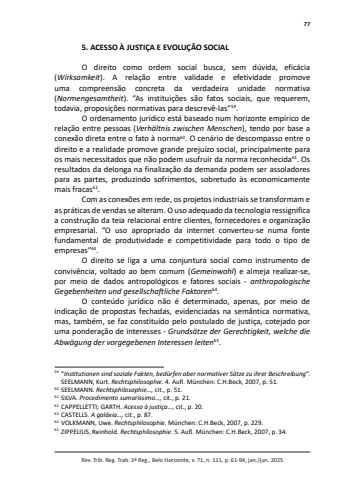 77Rev. Trib. Reg. Trab. 3ª Reg., Belo Horizonte, v. 71, n. 111, p. 61-94, jan./jun. 2025 5. ACESSO À JUSTIÇA E EVOLUÇÃO SOCIALO direito como ordem social busca, sem dúvida, eficácia (Wirksamkeit). A relação entre validade e efetividade promove uma compreensão concreta da verdadeira unidade normativa (Normengesamtheit). “As instituições são fatos sociais, que requerem, todavia, proposições normativas para descrevê-las”59.O ordenamento jurídico está baseado num horizonte empírico de relação entre pessoas (Verhältnis zwischen Menschen), tendo por base a conexão direta entre o fato à norma60. O cenário de descompasso entre o direito e a realidade promove grande prejuízo social, principalmente para os mais necessitados que não podem usufruir da norma reconhecida61. Os resultados da delonga na finalização da demanda podem ser assoladores para as partes, produzindo sofrimentos, sobretudo às economicamente mais fracas62.Com as conexões em rede, os projetos industriais se transformam e as práticas de vendas se alteram. O uso adequado da tecnologia ressignifica a construção da teia relacional entre clientes, fornecedores e organização empresarial. “O uso apropriado da internet converteu-se numa fonte fundamental de produtividade e competitividade para todo o tipo de empresas”63.O direito se liga a uma conjuntura social como instrumento de convivência, voltado ao bem comum (Gemeinwohl) e almeja realizar-se, por meio de dados antropológicos e fatores sociais - anthropologische Gegebenheiten und gesellschaftliche Faktoren64.O conteúdo jurídico não é determinado, apenas, por meio de indicação de propostas fechadas, evidenciadas na semântica normativa, mas, também, se faz constituído pelo postulado de justiça, cotejado por uma ponderação de interesses - Grundsätze der Gerechtigkeit, welche die Abwägung der vorgegebenen Interessen leiten65.59 “Institutionen sind soziale Fakten, bedürfen aber normativer Sätze zu ihrer Beschreibung”. SEELMANN, Kurt. Rechtsphilosophie. 4. Aufl. München: C.H.Beck, 2007, p. 51. 60 SEELMANN. Rechtsphilosophie…, cit., p. 51. 61 SILVA. Procedimento sumaríssimo…, cit., p. 21. 62 CAPPELLETTI; GARTH. Acesso à justiça…, cit., p. 20. 63 CASTELLS. A galáxia…, cit., p. 87. 64 VOLKMANN, Uwe. Rechtsphilosophie. München: C.H.Beck, 2007, p. 229. 65 ZIPPELIUS, Reinhold. Rechtsphilosophie. 5. Aufl. München: C.H.Beck, 2007, p. 34.