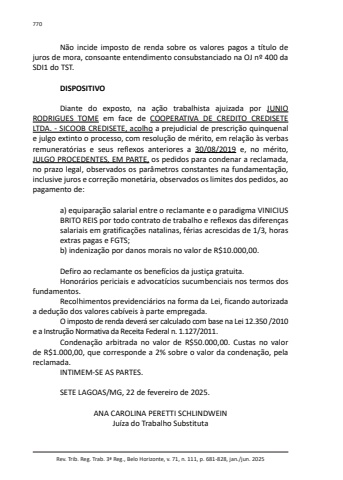 Rev. Trib. Reg. Trab. 3ª Reg., Belo Horizonte, v. 71, n. 111, p. 681-828, jan./jun. 2025770Não incide imposto de renda sobre os valores pagos a título de juros de mora, consoante entendimento consubstanciado na OJ nº 400 da SDI1 do TST.DISPOSITIVODiante do exposto, na ação trabalhista ajuizada por JUNIO RODRIGUES TOME em face de COOPERATIVA DE CREDITO CREDISETE LTDA. - SICOOB CREDISETE, acolho a prejudicial de prescrição quinquenal e julgo extinto o processo, com resolução de mérito, em relação às verbas remuneratórias e seus reflexos anteriores a 30/08/2019 e, no mérito, JULGO PROCEDENTES, EM PARTE, os pedidos para condenar a reclamada, no prazo legal, observados os parâmetros constantes na fundamentação, inclusive juros e correção monetária, observados os limites dos pedidos, ao pagamento de:a) equiparação salarial entre o reclamante e o paradigma VINICIUS BRITO REIS por todo contrato de trabalho e reflexos das diferenças salariais em gratificações natalinas, férias acrescidas de 1/3, horas extras pagas e FGTS;b) indenização por danos morais no valor de R$10.000,00.Defiro ao reclamante os benefícios da justiça gratuita.Honorários periciais e advocatícios sucumbenciais nos termos dos fundamentos.Recolhimentos previdenciários na forma da Lei, ficando autorizada a dedução dos valores cabíveis à parte empregada.O imposto de renda deverá ser calculado com base na Lei 12.350 /2010 e a Instrução Normativa da Receita Federal n. 1.127/2011.Condenação arbitrada no valor de R$50.000,00. Custas no valor de R$1.000,00, que corresponde a 2% sobre o valor da condenação, pela reclamada.INTIMEM-SE AS PARTES.SETE LAGOAS/MG, 22 de fevereiro de 2025.ANA CAROLINA PERETTI SCHLINDWEINJuíza do Trabalho Substituta