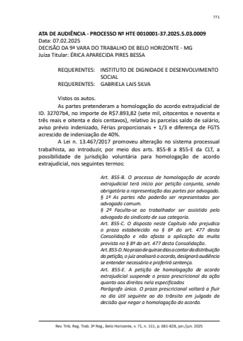 Rev. Trib. Reg. Trab. 3ª Reg., Belo Horizonte, v. 71, n. 111, p. 681-828, jan./jun. 2025771ATA DE AUDIÊNCIA - PROCESSO Nº HTE 0010001-37.2025.5.03.0009Data: 07.02.2025DECISÃO DA 9ª VARA DO TRABALHO DE BELO HORIZONTE - MGJuíza Titular: ÉRICA APARECIDA PIRE S BESSAREQUERENTES: INSTITUTO DE DIGNIDADE E DESENVOLVIMENTO SOCIALREQUERENTES: GABRIELA LAIS SILVAVistos os autos.As partes pretenderam a homologação do acordo extrajudicial de ID. 32707b4, no importe de R$7.893,82 (sete mil, oitocentos e noventa e três reais e oitenta e dois centavos), relativo às parcelas saldo de salário, aviso prévio indenizado, Férias proporcionais + 1/3 e diferença de FGTS acrescido de indenização de 40%.A Lei n. 13.467/2017 promoveu alteração no sistema processual trabalhista, ao introduzir, por meio dos arts. 855-B a 855-E da CLT, a possibilidade de jurisdição voluntária para homologação de acordo extrajudicial, nos seguintes termos:Art. 855-B. O processo de homologação de acordo extrajudicial terá início por petição conjunta, sendo obrigatória a representação das partes por advogado.§ 1º As partes não poderão ser representadas por advogado comum.§ 2º Faculta-se ao trabalhador ser assistido pelo advogado do sindicato de sua categoria.Art. 855-C. O disposto neste Capítulo não prejudica o prazo estabelecido no § 6º do art. 477 desta Consolidação e não afasta a aplicação da multa prevista no § 8º do art. 477 desta Consolidação.Art. 855-D. No prazo de quinze dias a contar da distribuição da petição, o juiz analisará o acordo, designará audiência se entender necessário e proferirá sentença.Art. 855-E. A petição de homologação de acordo extrajudicial suspende o prazo prescricional da ação quanto aos direitos nela especificadosParágrafo único. O prazo prescricional voltará a fluir no dia útil seguinte ao do trânsito em julgado da decisão que negar a homologação do acordo.