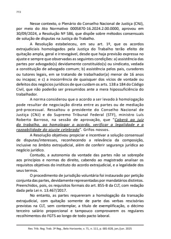 Rev. Trib. Reg. Trab. 3ª Reg., Belo Horizonte, v. 71, n. 111, p. 681-828, jan./jun. 2025772Nesse contexto, o Plenário do Conselho Nacional de Justiça (CNJ), por meio do Ato Normativo 0005870-16.2024.2.00.0000, aprovou em 30/09/2024, a Resolução Nº 586, que dispõe sobre métodos consensuais de solução de disputas na Justiça do Trabalho.A Resolução estabeleceu, em seu art. 1º, que os acordos extrajudiciais homologados pela Justiça do Trabalho terão efeito de quitação ampla, geral e irrevogável, desde que haja previsão expressa no ajuste e sempre que observadas as seguintes condições: a) assistência das partes por advogado(s) devidamente constituído(s) ou sindicato, vedada a constituição de advogado comum; b) assistência pelos pais, curadores ou tutores legais, em se tratando de trabalhador(a) menor de 16 anos ou incapaz; e c) a inocorrência de quaisquer dos vícios de vontade ou defeitos dos negócios jurídicos de que cuidam os arts. 138 a 184 do Código Civil, que não poderão ser presumidos ante a mera hipossuficiência do trabalhador.A norma considerou que o acordo a ser levado à homologação pode resultar de negociação direta entre as partes ou de mediação pré-processual. Ressaltou o presidente do Conselho Nacional de Justiça (CNJ) e do Supremo Tribunal Federal (STF), ministro Luís Roberto Barroso, na sessão de aprovação, que “Caberá ao juiz do trabalho, ao homologar o acordo, verificar a legalidade e a razoabilidade do ajuste celebrado”. Grifos nossos.A Resolução objetivou propiciar e incentivar a solução consensual de disputas/interesses, reconhecendo a relevância da composição, inclusive no âmbito extrajudicial, além de conferir segurança jurídica ao negócio jurídico.Contudo, a autonomia da vontade das partes não se sobrepõe aos princípios e normas do direito, cabendo ao magistrado analisar os requisitos objetivos do instituto do acordo extrajudicial, e a legalidade dos seus termos.O procedimento de jurisdição voluntária foi instaurado por petição conjunta das partes, devidamente representadas por mandatários distintos. Preenchidos, pois, os requisitos formais do art. 855-B da CLT, com redação dada pela Lei n. 13.467/2017.No entanto, as partes requereram a homologação da transação extrajudicial, com quitação somente de parte das verbas rescisórias previstas na CLT, sem contemplar, a título de exemplificação, o décimo terceiro salário proporcional e tampouco comprovarem os regulares recolhimentos do FGTS ao longo de todo pacto laboral.