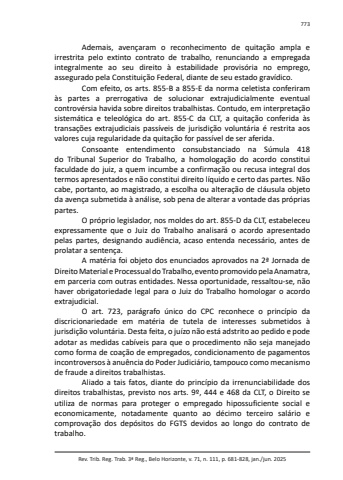 Rev. Trib. Reg. Trab. 3ª Reg., Belo Horizonte, v. 71, n. 111, p. 681-828, jan./jun. 2025773Ademais, avençaram o reconhecimento de quitação ampla e irrestrita pelo extinto contrato de trabalho, renunciando a empregada integralmente ao seu direito à estabilidade provisória no emprego, assegurado pela Constituição Federal, diante de seu estado gravídico.Com efeito, os arts. 855-B a 855-E da norma celetista conferiram às partes a prerrogativa de solucionar extrajudicialmente eventual controvérsia havida sobre direitos trabalhistas. Contudo, em interpretação sistemática e teleológica do art. 855-C da CLT, a quitação conferida às transações extrajudiciais passíveis de jurisdição voluntária é restrita aos valores cuja regularidade da quitação for passível de ser aferida.Consoante entendimento consubstanciado na Súmula 418 do Tribunal Superior do Trabalho, a homologação do acordo constitui faculdade do juiz, a quem incumbe a confirmação ou recusa integral dos termos apresentados e não constitui direito líquido e certo das partes. Não cabe, portanto, ao magistrado, a escolha ou alteração de cláusula objeto da avença submetida à análise, sob pena de alterar a vontade das próprias partes.O próprio legislador, nos moldes do art. 855-D da CLT, estabeleceu expressamente que o Juiz do Trabalho analisará o acordo apresentado pelas partes, designando audiência, acaso entenda necessário, antes de prolatar a sentença.A matéria foi objeto dos enunciados aprovados na 2ª Jornada de Direito Material e Processual do Trabalho, evento promovido pela Anamatra, em parceria com outras entidades. Nessa oportunidade, ressaltou-se, não haver obrigatoriedade legal para o Juiz do Trabalho homologar o acordo extrajudicial.O art. 723, parágrafo único do CPC reconhece o princípio da discricionariedade em matéria de tutela de interesses submetidos à jurisdição voluntária. Desta feita, o juízo não está adstrito ao pedido e pode adotar as medidas cabíveis para que o procedimento não seja manejado como forma de coação de empregados, condicionamento de pagamentos incontroversos à anuência do Poder Judiciário, tampouco como mecanismo de fraude a direitos trabalhistas.Aliado a tais fatos, diante do princípio da irrenunciabilidade dos direitos trabalhistas, previsto nos arts. 9º, 444 e 468 da CLT, o Direito se utiliza de normas para proteger o empregado hipossuficiente social e economicamente, notadamente quanto ao décimo terceiro salário e comprovação dos depósitos do FGTS devidos ao longo do contrato de trabalho.