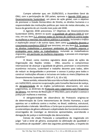 Rev. Trib. Reg. Trab. 3ª Reg., Belo Horizonte, v. 71, n. 111, p. 681-828, jan./jun. 2025775Cumpre salientar que, em 25/09/2015, a Assembleia Geral da ONU, com a participação de 193 países, aprovou a Agenda 2030 para o Desenvolvimento Sustentável, um plano de ação global, com o objetivo de promover o Estado Democrático de Direito, os direitos humanos e a responsividade das instituições políticas por meio de metas elencadas, na busca da garantia de um mundo mais justo até 2030.A Agenda 2030 preconizou 17 Objetivos de Desenvolvimento Sustentável (ODS), dentre os quais: a igualdade de gênero (ODS 5) que visa, em seu item 5.2, eliminar todas as formas de violência contra todas as mulheres e meninas nas esferas públicas e privadas, incluindo o tráfico e exploração sexual e de outros tipos; bem como o trabalho decente e crescimento econômico (ODS 8) que tenciona, em seu item 8.8, “proteger os direitos trabalhistas e promover ambientes de trabalho seguros e protegidos para todos os trabalhadores, incluindo os trabalhadores migrantes, em particular as mulheres migrantes, e pessoas em empregos precários”.O Brasil, como membro signatário deste plano de ações da Organização das Nações Unidas - ONU, assumiu o compromisso internacional de alcançar a igualdade de gênero, promover o crescimento econômico inclusivo, sustentável e trabalho decente para todos, além de reduzir as desigualdades e promover o acesso à justiça para todos e construir instituições eficazes e inclusivas em todos os níveis (Objetivos de Desenvolvimento Sustentável - ODS nº 5, 8, 10 e 16).Nesse sentido, relevante fato ocorrido no Poder Judiciário Brasileiro, em 14/03/2023, concerne na aprovação, pelo Conselho Nacional de Justiça, da obrigatoriedade de os órgãos jurisdicionais observarem, em seus julgamentos, as diretrizes do Protocolo para Julgamento com Perspectiva de Gênero, nos termos da Resolução nº 492/2023, para ampliar o acesso à justiça por mulheres e meninas.A obrigatoriedade de observância do Protocolo originou-se de determinação da Corte Interamericana de Direito Humanos, a qual apontou ser a violência contra a mulher, no Brasil, sistêmica, estrutural, generalizada e tolerada. Identificou a Corte que os preconceitos pessoais e os estereótipos de gênero afetavam a objetividade dos funcionários estatais encarregados de investigar as denúncias apresentadas, acarretando a denegação de justiça e revitimização das denunciantes.Extraio do citado Protocolo a competência do magistrado em julgar “sob a lente de gênero, avançando na efetivação da igualdade e nas políticas de equidade”, além das seguintes ponderações, a respeito do