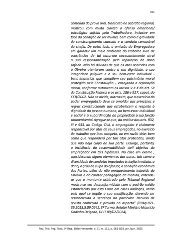 Rev. Trib. Reg. Trab. 3ª Reg., Belo Horizonte, v. 71, n. 111, p. 681-828, jan./jun. 2025781conteúdo da prova oral, transcrito no acórdão regional, mostrou com muita clareza a ofensa emocional/psicológica sofrida pela Trabalhadora, inclusive em face da condição de ser mulher, bem como a gravidade do constrangimento causado e a conduta censurável da chefia. De outro lado, a omissão da Empregadora em garantir um meio ambiente do trabalho livre de ocorrências de tal natureza necessariamente atrai a sua responsabilização pela reparação do dano sofrido. Não há dúvidas de que os atos ocorridos com a Obreira atentaram contra a sua dignidade, a sua integridade psíquica e o seu bem-estar individual - bens imateriais que compõem seu patrimônio moral protegido pela Constituição -, ensejando a reparação moral, conforme autorizam os incisos V e X do art. 5º da Constituição Federal e os arts. 186 e 927, caput, do CCB/2002. Não se olvide, outrossim, que o exercício do poder empregatício deve se amoldar aos princípios e regras constitucionais que estabelecem o respeito à dignidade da pessoa humana, ao bem-estar individual e social e à subordinação da propriedade à sua função socioambiental. Agregue-se que, da análise dos arts. 932, III e 933, do Código Civil, o empregador é civilmente responsável por atos de seus empregados, no exercício do trabalho que lhes competir, ou em razão dele; bem como que responderá por tais atos praticados, ainda que não haja culpa de sua parte. Exsurge, portanto, a incidência da responsabilidade civil objetiva do empregador em tais hipóteses. No caso em exame , considerando alguns elementos dos autos, tais como a diversidade de condutas imputadas à chefia imediata, o dano, o grau de culpa do ofensor, a condição econômica das Partes, além do não enriquecimento indevido da Obreira e do caráter pedagógico da medida, entendese que o montante arbitrado pelo Tribunal Regional mostra-se em desconformidade com o padrão médio estabelecido por esta Corte em casos análogos, razão pela qual se impõe a sua modificação, devendo ser restabelecida a sentença no particular. Recurso de revista conhecido e provido no aspecto” (RRAg-971-39.2015.5.09.0242, 3ª Turma, Relator Ministro Mauricio Godinho Delgado, DEJT 09/02/2024).