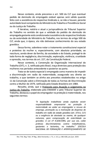 Rev. Trib. Reg. Trab. 3ª Reg., Belo Horizonte, v. 71, n. 111, p. 681-828, jan./jun. 2025782Nesse contexto, ainda preconiza o art. 500 da CLT que eventual pedido de demissão do empregado estável apenas será válido quando feito com a assistência do respectivo Sindicato e, se não o houver, perante autoridade local competente do Ministério do Trabalho e Previdência Social ou da Justiça do Trabalho.É iterativa, notória e atual a jurisprudência do Tribunal Superior do Trabalho no sentido de que a validade do pedido de demissão de empregada gestante está condicionada à assistência do respectivo Sindicato ou da autoridade do Ministério do Trabalho, nos termos do artigo 500 da CLT, ainda que, à época, ela não detivesse conhecimento do seu estado gravídico.Dessa forma, sobreleva notar o tratamento constitucional especial e protetivo da mulher e, especialmente, com absoluta prioridade, ao nascituro, sendo dever da família, da sociedade e do Estado, protegê-lo de toda forma de negligência, discriminação, exploração, violência, crueldade e opressão, nos termos do art. 227, da Constituição Federal.Nesse contexto, a Convenção da Organização Internacional do Trabalho (OIT), n. 3, ratificada pelo Brasil, traça diretrizes para proteção das mulheres nos períodos antecedente e posterior ao parto.Trata-se de tutela especial à empregada como maneira de impedir a discriminação em razão da maternidade, assegurado seu direito ao trabalho, o que também se alinha aos preceitos estabelecidos no artigo 11 da Convenção sobre a Eliminação de todas as Formas de Discriminação contra a Mulher de 1979, ratificada pelo Estado Brasileiro em 1984.Ressalto, ainda, que o Protocolo para Atuação e Julgamento na Justiça do Trabalho, elaborado pela ENAMAT e pelo Tribunal Superior do Trabalho, destacou o papel do empregador na proteção à maternidade, nos seguintes termos:“A legislação trabalhista ainda explicita existir responsabilidade empresarial na proteção à maternidade ao vedar ao empregador a recusa de emprego, promoção ou a motivação da dispensa do trabalho em razão do estado gravídico (art. 373-A, CLT) ou a exigência de atestado ou exame, de qualquer natureza, para comprovação de esterilidade ou gravidez. A Lei nº 9.029/1995, por sua vez, coíbe práticas discriminatórias contra trabalhadoras, gestantes e lactantes, no trabalho.” (ESCOLA NACIONAL DE FORMAÇÃO E APERFEIÇOAMENTO DE