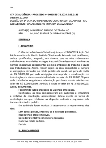 Rev. Trib. Reg. Trab. 3ª Reg., Belo Horizonte, v. 71, n. 111, p. 681-828, jan./jun. 2025784ATA DE AUDIÊNCIA - PROCESSO Nº 0010525-78.2024.5.03.0135Data: 04.10.2024DECISÃO DA 3ª VARA DO TRABALHO DE GOVERNADOR VALADARES - MGJuiz Substituto: WALACE HELENO MIRANDA DE ALVARENGAAUTOR(A): MINISTÉRIO PÚBLICO DO TRABALHORÉU: MURILO SARTI DE OLIVEIRA E OUTROS (1)SENTENÇAI - RELATÓRIOO Ministério Público do Trabalho ajuizou, em 23/06/2024, Ação Civil Pública em face de Murilo Sarti de Oliveira e de Reinaldo José de Oliveira, ambos qualificados, alegando, em síntese, que os réus submeteram trabalhadores a condições análogas à escravidão e descumpriram diversas normas imperativas concernentes ao meio ambiente de trabalho e saúde dos trabalhadores. Assim, requer sejam os réus compelidos a cumprir as obrigações elencadas no rol de pedidos da inicial, sob pena de multa de R$ 10.000,00 por cada obrigação descumprida, e condenação em indenização por danos morais individuais no valor de R$ 70.000,00 para cada trabalhador resgatado e indenização por danos morais coletivos no valor de R$ 3.000.000,00. Atribuiu à causa o valor de R$ 3.490.000,00. Juntou documentos.Foi deferida tutela provisória de urgência antecipada.Notificados, os réus compareceram em audiência e, infrutífera a tentativa de conciliação, apresentaram defesa escrita na forma de contestação em que refutaram as alegações autorais e pugnaram pela improcedência dos pedidos.Em audiência foram ouvidas 2 testemunhas a requerimento dos réus.Sem outras provas, encerrou-se a instrução processual.Razões finais orais remissivas.Derradeira tentativa conciliatória recusada.É o breve relato do feito.Decido.II - FUNDAMENTOS