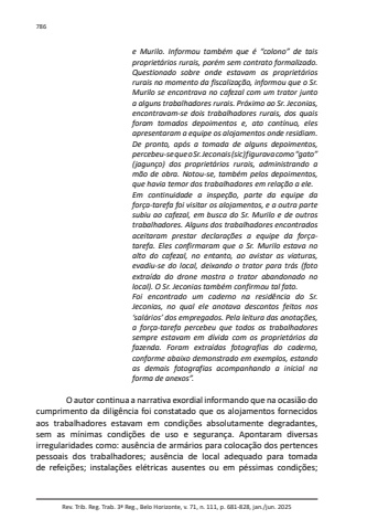 Rev. Trib. Reg. Trab. 3ª Reg., Belo Horizonte, v. 71, n. 111, p. 681-828, jan./jun. 2025786e Murilo. Informou também que é “colono” de tais proprietários rurais, porém sem contrato formalizado. Questionado sobre onde estavam os proprietários rurais no momento da fiscalização, informou que o Sr. Murilo se encontrava no cafezal com um trator junto a alguns trabalhadores rurais. Próximo ao Sr. Jeconias, encontravam-se dois trabalhadores rurais, dos quais foram tomados depoimentos e, ato contínuo, eles apresentaram a equipe os alojamentos onde residiam.De pronto, após a tomada de alguns depoimentos, percebeu-se que o Sr. Jeconais (sic) figurava como “gato” (jagunço) dos proprietários rurais, administrando a mão de obra. Notou-se, também pelos depoimentos, que havia temor dos trabalhadores em relação a ele.Em continuidade a inspeção, parte da equipe da força-tarefa foi visitar os alojamentos, e a outra parte subiu ao cafezal, em busca do Sr. Murilo e de outros trabalhadores. Alguns dos trabalhadores encontrados aceitaram prestar declarações a equipe da forçatarefa. Eles confirmaram que o Sr. Murilo estava no alto do cafezal, no entanto, ao avistar as viaturas, evadiu-se do local, deixando o trator para trás (foto extraída do drone mostra o trator abandonado no local). O Sr. Jeconias também confirmou tal fato.Foi encontrado um caderno na residência do Sr. Jeconias, no qual ele anotava descontos feitos nos ‘salários’ dos empregados. Pela leitura das anotações, a força-tarefa percebeu que todos os trabalhadores sempre estavam em dívida com os proprietários da fazenda. Foram extraídas fotografias do caderno, conforme abaixo demonstrado em exemplos, estando as demais fotografias acompanhando a inicial na forma de anexos”.O autor continua a narrativa exordial informando que na ocasião do cumprimento da diligência foi constatado que os alojamentos fornecidos aos trabalhadores estavam em condições absolutamente degradantes, sem as mínimas condições de uso e segurança. Apontaram diversas irregularidades como: ausência de armários para colocação dos pertences pessoais dos trabalhadores; ausência de local adequado para tomada de refeições; instalações elétricas ausentes ou em péssimas condições;