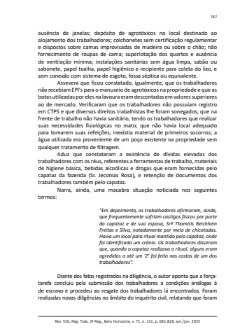 Rev. Trib. Reg. Trab. 3ª Reg., Belo Horizonte, v. 71, n. 111, p. 681-828, jan./jun. 2025787ausência de janelas; depósito de agrotóxicos no local destinado ao alojamento dos trabalhadores; colchonetes sem certificação regulamentar e dispostos sobre camas improvisadas de madeira ou sobre o chão; não fornecimento de roupas de cama; superlotação dos quartos e ausência de ventilação mínima; instalações sanitárias sem água limpa, sabão ou sabonete, papel toalha, papel higiênico e recipiente para coleta do lixo, e sem conexão com sistema de esgoto, fossa séptica ou equivalente.Assevera que ficou constatado, igualmente, que os trabalhadores não recebiam EPI’s para o manuseio de agrotóxicos na propriedade e que as botas utilizadas por eles na lavoura eram descontadas em valores superiores ao de mercado. Verificaram que os trabalhadores não possuíam registro em CTPS e que diversos direitos trabalhistas lhe foram sonegados; que na frente de trabalho não havia sanitário, tendo os trabalhadores que realizar suas necessidades fisiológicas no mato; que não havia local adequado para tomarem suas refeições; inexistia material de primeiros socorros; a água utilizada era proveniente de um poço existente na propriedade sem qualquer tratamento de filtragem.Aduz que constataram a existência de dívidas elevadas dos trabalhadores com os réus, referentes a ferramentas de trabalho, materiais de higiene básica, bebidas alcoólicas e drogas que eram fornecidas pelo capataz da fazenda (Sr. Jeconias Rosa), e retenção de documentos dos trabalhadores também pelo capataz.Narra, ainda, uma macabra situação noticiada nos seguintes termos:“Em depoimento, os trabalhadores afirmaram, ainda, que frequentemente sofriam castigos físicos por parte do capataz e de sua esposa, Srª Thamiris Reichhein Freitas e Silva, notadamente por meio de chicotadas. Havia um local para ritual mantido pelo capataz, onde foi identificado um crânio. Os trabalhadores disseram que, quando o capataz realizava o ritual, alguns eram agredidos a até um ‘Z’ foi feito nas costas de um dos trabalhadores”.Diante dos fatos registrados na diligência, o autor aponta que a forçatarefa concluiu pela submissão dos trabalhadores a condições análogas à de escravo e procedeu ao resgate dos trabalhadores lá encontrados. Foram realizadas novas diligências no âmbito do inquérito civil, relatando que foram