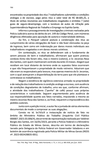 Rev. Trib. Reg. Trab. 3ª Reg., Belo Horizonte, v. 71, n. 111, p. 681-828, jan./jun. 2025788encontrados na propriedade dos réus 7 trabalhadores submetidos a condições análogas a de escravo, pago pelos réus o valor total de R$ 68.605,25, a título de verbas rescisórias aos trabalhadores resgatados e emitidas 7 (sete) guias de seguro-desemprego, com a lavratura de autos de infração pela Superintendência Regional do Trabalho e Emprego no Espírito Santo.Informa o prosseguimento de investigações criminais realizadas pela Polícia Judiciária acerca do delito do art. 149 do Código Penal, com inúmeras diligências efetivadas para apuração de autoria e materialidade delitivas.Ao fim, o Parquet Laboral postula a condenação dos réus ao cumprimento de várias obrigações de fazer e não fazer elencadas na peça de ingresso, bem como em indenização por danos morais individuais aos trabalhadores resgatados e em danos morais coletivos.Em contestação, os réus se defenderam sob o fundamento de serem pessoas de bem e trabalhadores; afirmaram que quem praticou conduta ilícita não foram eles, mas o meeiro (colono), o Sr. Jeconias Rosa dos Santos, com quem mantiveram contrato durante 23 meses. Alegam que residiam em local distante do terreno onde os supostos fatos ocorreram e que não frequentavam a propriedade de modo rotineiro. Aduziram que não eram os responsáveis pela lavoura, mas apenas meeiros do Sr. Jeconias, com o qual avençaram a disponibilização da terra para que ele plantasse e contratasse os trabalhadores.Negam a existência de vigilância ostensiva armada na propriedade e de redução dos trabalhadores à condição análoga a escravo, com ausência de condições degradantes de trabalho, uma vez que, conforme afirmam, a atividade dos trabalhadores (“panha” de café) possui suas próprias características e rusticidade. Seguem argumentando pela ausência de sua responsabilidade quanto aos fatos narrados, imputando a mesma ao meeiro Jeconias Rosa dos Santos e, ao final, requerem a improcedência dos pedidos autorais.Junto com a petição inicial, o autor fez a juntada de vários elementos documentais de modo a comprovar as suas alegações.Consta no Id. bc7d1c9 a instauração de notícia de fato no âmbito do Ministério Público do Trabalho (Inquérito Civil Público 000007.2023.03.006/4), decorrente de representação realizada por Valdinei Borges dos Santos, em 16/01/2023, perante a Polícia Federal e o Ministério Público do Estado de Minas Gerais, descrita em termo de declarações lavrado pela Delegacia de Polícia Federal em Governador Valadares e em boletim de ocorrência registrado pela Polícia Militar de Minas Gerais (REDS nº. 2023-002428835-001).