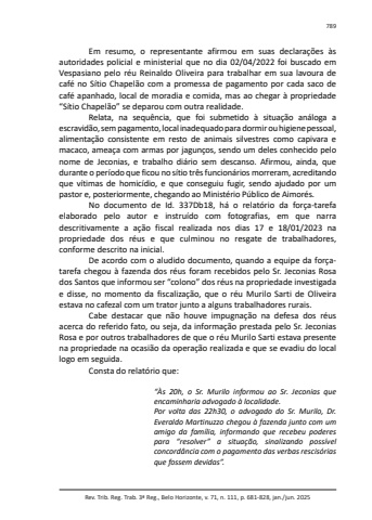 Rev. Trib. Reg. Trab. 3ª Reg., Belo Horizonte, v. 71, n. 111, p. 681-828, jan./jun. 2025789Em resumo, o representante afirmou em suas declarações às autoridades policial e ministerial que no dia 02/04/2022 foi buscado em Vespasiano pelo réu Reinaldo Oliveira para trabalhar em sua lavoura de café no Sítio Chapelão com a promessa de pagamento por cada saco de café apanhado, local de moradia e comida, mas ao chegar à propriedade “Sítio Chapelão” se deparou com outra realidade.Relata, na sequência, que foi submetido à situação análoga a escravidão, sem pagamento, local inadequado para dormir ou higiene pessoal, alimentação consistente em resto de animais silvestres como capivara e macaco, ameaça com armas por jagunços, sendo um deles conhecido pelo nome de Jeconias, e trabalho diário sem descanso. Afirmou, ainda, que durante o período que ficou no sítio três funcionários morreram, acreditando que vítimas de homicídio, e que conseguiu fugir, sendo ajudado por um pastor e, posteriormente, chegando ao Ministério Público de Aimorés.No documento de Id. 337Db18, há o relatório da força-tarefa elaborado pelo autor e instruído com fotografias, em que narra descritivamente a ação fiscal realizada nos dias 17 e 18/01/2023 na propriedade dos réus e que culminou no resgate de trabalhadores, conforme descrito na inicial.De acordo com o aludido documento, quando a equipe da forçatarefa chegou à fazenda dos réus foram recebidos pelo Sr. Jeconias Rosa dos Santos que informou ser “colono” dos réus na propriedade investigada e disse, no momento da fiscalização, que o réu Murilo Sarti de Oliveira estava no cafezal com um trator junto a alguns trabalhadores rurais.Cabe destacar que não houve impugnação na defesa dos réus acerca do referido fato, ou seja, da informação prestada pelo Sr. Jeconias Rosa e por outros trabalhadores de que o réu Murilo Sarti estava presente na propriedade na ocasião da operação realizada e que se evadiu do local logo em seguida.Consta do relatório que:“Às 20h, o Sr. Murilo informou ao Sr. Jeconias que encaminharia advogado à localidade.Por volta das 22h30, o advogado do Sr. Murilo, Dr. Everaldo Martinuzzo chegou à fazenda junto com um amigo da família, informando que recebeu poderes para “resolver” a situação, sinalizando possível concordância com o pagamento das verbas rescisórias que fossem devidas”.
