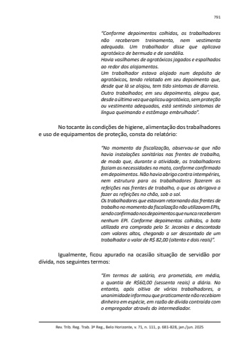 Rev. Trib. Reg. Trab. 3ª Reg., Belo Horizonte, v. 71, n. 111, p. 681-828, jan./jun. 2025791“Conforme depoimentos colhidos, os trabalhadores não receberam treinamento, nem vestimenta adequada. Um trabalhador disse que aplicava agrotóxico de bermuda e de sandália.Havia vasilhames de agrotóxicos jogados e espalhados ao redor dos alojamentos.Um trabalhador estava alojado num depósito de agrotóxicos, tendo relatado em seu depoimento que, desde que lá se alojou, tem tido sintomas de diarreia.Outro trabalhador, em seu depoimento, alegou que, desde a última vez que aplicou agrotóxico, sem proteção ou vestimenta adequadas, está sentindo sintomas de língua queimando e estômago embrulhado”.No tocante às condições de higiene, alimentação dos trabalhadores e uso de equipamentos de proteção, consta do relatório:“No momento da fiscalização, observou-se que não havia instalações sanitárias nas frentes de trabalho, de modo que, durante a atividade, os trabalhadores faziam as necessidades no mato, conforme confirmado em depoimentos. Não havia abrigo contra intempéries, nem estrutura para os trabalhadores fazerem as refeições nas frentes de trabalho, o que os obrigava a fazer as refeições no chão, sob o sol.Os trabalhadores que estavam retornando das frentes de trabalho no momento da fiscalização não utilizavam EPIs, sendo confirmado nos depoimentos que nunca receberam nenhum EPI. Conforme depoimentos colhidos, a bota utilizada era comprada pelo Sr. Jeconias e descontada com valores altos, chegando a ser descontado de um trabalhador o valor de R$ 82,00 (oitenta e dois reais)”.Igualmente, ficou apurado na ocasião situação de servidão por dívida, nos seguintes termos:“Em termos de salário, era prometida, em média, a quantia de R$60,00 (sessenta reais) a diária. No entanto, após oitiva de vários trabalhadores, a unanimidade informou que praticamente não recebiam dinheiro em espécie, em razão de dívida contraída com o empregador através do intermediador.