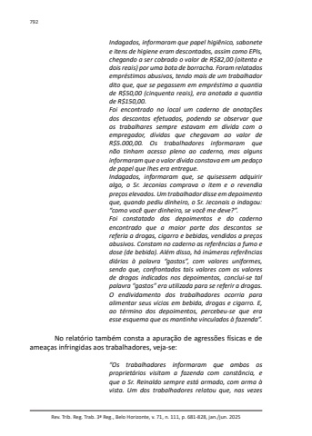 Rev. Trib. Reg. Trab. 3ª Reg., Belo Horizonte, v. 71, n. 111, p. 681-828, jan./jun. 2025792Indagados, informaram que papel higiênico, sabonete e itens de higiene eram descontados, assim como EPIs, chegando a ser cobrado o valor de R$82,00 (oitenta e dois reais) por uma bota de borracha. Foram relatados empréstimos abusivos, tendo mais de um trabalhador dito que, que se pegassem em empréstimo a quantia de R$50,00 (cinquenta reais), era anotada a quantia de R$150,00.Foi encontrado no local um caderno de anotações dos descontos efetuados, podendo se observar que os trabalhares sempre estavam em dívida com o empregador, dívidas que chegavam ao valor de R$5.000,00. Os trabalhadores informaram que não tinham acesso pleno ao caderno, mas alguns informaram que o valor dívida constava em um pedaço de papel que lhes era entregue.Indagados, informaram que, se quisessem adquirir algo, o Sr. Jeconias comprava o item e o revendia preços elevados. Um trabalhador disse em depoimento que, quando pediu dinheiro, o Sr. Jeconais o indagou: “como você quer dinheiro, se você me deve?”.Foi constatado dos depoimentos e do caderno encontrado que a maior parte dos descontos se referia a drogas, cigarro e bebidas, vendidos a preços abusivos. Constam no caderno as referências a fumo e dose (de bebida). Além disso, há inúmeras referências diárias à palavra “gastos”, com valores uniformes, sendo que, confrontados tais valores com os valores de drogas indicados nos depoimentos, conclui-se tal palavra “gastos” era utilizada para se referir a drogas.O endividamento dos trabalhadores ocorria para alimentar seus vícios em bebida, drogas e cigarro. E, ao término dos depoimentos, percebeu-se que era esse esquema que os mantinha vinculados à fazenda”.No relatório também consta a apuração de agressões físicas e de ameaças infringidas aos trabalhadores, veja-se:“Os trabalhadores informaram que ambos os proprietários visitam a fazenda com constância, e que o Sr. Reinaldo sempre está armado, com arma à vista. Um dos trabalhadores relatou que, nas vezes