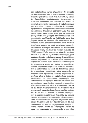 Rev. Trib. Reg. Trab. 3ª Reg., Belo Horizonte, v. 71, n. 111, p. 681-828, jan./jun. 2025796aos trabalhadores rurais dispositivos de proteção pessoal de acordo com os riscos de cada atividade, conforme previsto no item 31.6.2 da NR 31; Deixar de disponibilizar, gratuitamente, ferramentas e acessórios adequados ao trabalho, ou deixar de substituir ferramentas e acessórios de trabalho sempre que necessário; Permitir a utilização de máquinas, equipamentos ou implementos em desacordo com as especificações técnicas do fabricante e/ou fora dos limites operacionais e restrições por ele indicados e/ou permitir sua operação por trabalhadores sem capacitação, qualificação ou habilitação para tais funções; Deixar de elaborar e/ou implementar e/ou custear o PGRTR, por estabelecimento rural, por meio de ações de segurança e saúde que visem a prevenção de acidentes e doenças decorrentes do trabalho nas atividades rurais, ou deixar de realizar a revisão do PGRTR a cada 3 (três) anos ou nas situações previstas no item 31.3.4 da NR 31; Permitir a reutilização, para qualquer fim, das embalagens vazias de agrotóxicos, aditivos, adjuvantes ou produtos afins, incluindo as respectivas tampas, e/ou permitir a armazenagem de embalagens vazias ou cheias de agrotóxicos, aditivos, adjuvantes ou produtos afins em desacordo com o estabelecido na bula do fabricante; Deixar de proporcionar capacitação sobre prevenção de acidentes com agrotóxicos, aditivos, adjuvantes ou produtos afins a todos os trabalhadores expostos diretamente, ou proporcionar capacitação aos trabalhadores em exposição direta em desacordo com a modalidade, carga horária, conteúdo programático e/ou responsabilidade técnica estabelecidos na NR 31, ou deixar de complementar ou de realizar novo programa de capacitação conforme previsto no item 31.7.5.3 da NR 31; Admitir ou manter empregado sem o respectivo registro em livro, ficha ou sistema eletrônico competente, o empregador não enquadrado como microempresa ou empresa de pequeno porte; Deixar de efetuar, até o 5º (quinto) dia útil do mês subseqüente ao vencido, o pagamento integral do salário mensal devido ao empregado; Deixar de pagar ao empregado a remuneração, à que fizer