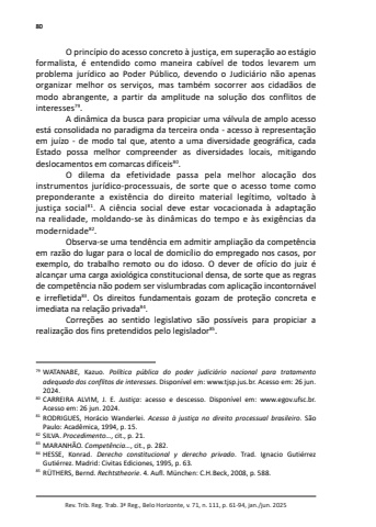80Rev. Trib. Reg. Trab. 3ª Reg., Belo Horizonte, v. 71, n. 111, p. 61-94, jan./jun. 2025O princípio do acesso concreto à justiça, em superação ao estágio formalista, é entendido como maneira cabível de todos levarem um problema jurídico ao Poder Público, devendo o Judiciário não apenas organizar melhor os serviços, mas também socorrer aos cidadãos de modo abrangente, a partir da amplitude na solução dos conflitos de interesses79.A dinâmica da busca para propiciar uma válvula de amplo acesso está consolidada no paradigma da terceira onda - acesso à representação em juízo - de modo tal que, atento a uma diversidade geográfica, cada Estado possa melhor compreender as diversidades locais, mitigando deslocamentos em comarcas difíceis80.O dilema da efetividade passa pela melhor alocação dos instrumentos jurídico-processuais, de sorte que o acesso tome como preponderante a existência do direito material legítimo, voltado à justiça social81. A ciência social deve estar vocacionada à adaptação na realidade, moldando-se às dinâmicas do tempo e às exigências da modernidade82.Observa-se uma tendência em admitir ampliação da competência em razão do lugar para o local de domicílio do empregado nos casos, por exemplo, do trabalho remoto ou do idoso. O dever de ofício do juiz é alcançar uma carga axiológica constitucional densa, de sorte que as regras de competência não podem ser vislumbradas com aplicação incontornável e irrefletida83. Os direitos fundamentais gozam de proteção concreta e imediata na relação privada84.Correções ao sentido legislativo são possíveis para propiciar a realização dos fins pretendidos pelo legislador85.79 WATANABE, Kazuo. Política pública do poder judiciário nacional para tratamento adequado dos conflitos de interesses. Disponível em: www.tjsp.jus.br. Acesso em: 26 jun. 2024. 80 CARREIRA ALVIM, J. E. Justiça: acesso e descesso. Disponível em: www.egov.ufsc.br. Acesso em: 26 jun. 2024. 81 RODRIGUES, Horácio Wanderlei. Acesso à justiça no direito processual brasileiro. São Paulo: Acadêmica, 1994, p. 15. 82 SILVA. Procedimento…, cit., p. 21. 83 MARANHÃO. Competência…, cit., p. 282. 84 HESSE, Konrad. Derecho constitucional y derecho privado. Trad. Ignacio Gutiérrez Gutiérrez. Madrid: Civitas Ediciones, 1995, p. 63. 85 RÜTHERS, Bernd. Rechtstheorie. 4. Aufl. München: C.H.Beck, 2008, p. 588.