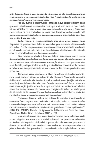 Rev. Trib. Reg. Trab. 3ª Reg., Belo Horizonte, v. 71, n. 111, p. 681-828, jan./jun. 2025802o Sr. Jeconias Rosa e que, apesar de não saber se ele trabalhava para os réus, sempre o via na propriedade dos réus “movimentando junto com os companheiros”, conforme se expressa.Por seu turno, a testemunha Fernando Gava Zorzal também disse que não trabalhou na fazenda dos réus, que é vizinho deles e que reside há uns 4/5 Km dos réus e que não frequenta a fazenda deles. Disse que com certeza os réus contratam pessoas para trabalhar na lavoura de café existente na propriedade deles; que passa próximo à propriedade dos réus, em média, 1 vez por mês.Deste modo, a responsabilidade dos réus pelos graves fatos flagrados na propriedade deles se encontra patentemente demonstrada nos autos. Os réus exploravam economicamente a propriedade, mediante o cultivo de lavouras de café e se beneficiavam diretamente da mão de obra dos trabalhadores que lá eram explorados.Não merece acolhida a tese de defesa, segundo a qual o autor direto dos fatos ser o Sr. Jeconias Rosa, uma vez que os elementos de prova carreados aos autos demonstraram a atuação deste como preposto dos réus. De fato, a alegação dos réus de que não tinham conhecimento do que acontecia em sua propriedade vai ao encontro das provas produzidas no processo.Ainda que assim não fosse, a título de reforço de fundamentação, cabe aqui invocar, ainda, a aplicação da chamada “teoria da cegueira deliberada”, oriunda do Direito Penal estadunidense (willful blindness doctrine), também conhecida como “teoria do avestruz”. De acordo com essa construção jurídico-científica, que encontra ressonância no direito penal brasileiro, caso o réu possuísse condições de saber se participava de atividade ilícita, mas optou por fechar os olhos à descoberta, seria tão culpável quanto se possuísse o conhecimento pleno.Conforme Ragués i Vallés, em estado de ignorância deliberada se encontra “todo aquele que podendo e devendo conhecer determinadas circunstâncias penalmente relevantes de sua conduta, toma deliberada ou conscientemente a decisão de manter-se na ignorância com relação a elas”. (RAGUÉS I VALLÉS, Ramón. La ignorancia deliberada en Derecho penal. Barcelona: Atelier Libros Juridicos, 2007, p. 25).Insta ressaltar que este Juízo não desconhece que os elementos de prova coligidos aos autos com a inicial, sobretudo os que foram coletados no âmbito de inquérito civil público gozam de relativo valor probante e devem ser analisados em conjunto com todas as provas produzidas em juízo sob o crivo das garantias do contraditório e da ampla defesa. Há que