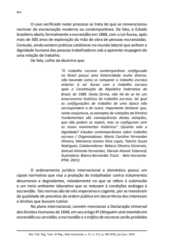 Rev. Trib. Reg. Trab. 3ª Reg., Belo Horizonte, v. 71, n. 111, p. 681-828, jan./jun. 2025804O caso verificado neste processo se trata do que se convencionou nominar de escravização moderna ou contemporânea. De fato, o Estado brasileiro aboliu formalmente a escravidão em 1888, com a Lei Áurea, após mais de 300 anos de exploração da mão de obra de pessoas escravizadas. Contudo, ainda existem práticas cotidianas no mundo laboral que aviltam a dignidade humana das pessoas trabalhadores sob a aparente roupagem de uma relação de trabalho.De fato, colho da doutrina que:“O trabalho escravo contemporâneo configurado no Brasil possui uma historicidade muito diversa, não havendo como se comparar o trabalho escravo anterior à Lei Áurea com o trabalho escravo após a Constituição da República Federativa do Brasil, de 1988. Desta forma, não há de se ter um anacronismo histórico do trabalho escravo, tal qual as configurações de trabalho de uma época não correspondem a de outra. Importante destacar que, nesta conjuntura, os exemplos de violações de Direitos Fundamentais são consequências destas violações, que não podem se repetir, mas se configuram com os novos movimentos históricos”. (Quanto vale a dignidade? Estudos contemporâneos sobre trabalho escravo / Organizadoras: Maria Carolina Fernandes Oliveira, Marianna Gomes Silva Lopes, Tamíris Souza Rodrigues; Colaboradores: Rebeca Oliveira Generoso, Samuel Almeida Fernandez, Shevah Ahavat Esberard; Ilustradora: Bianca Bernardes Trazzi. - Belo Horizonte: RTM, 2021).O ordenamento jurídico internacional e doméstico possui um cipoal normativo que visa a proteção do trabalhador contra tratamentos desumanos e degradantes, notadamente no que se refere à submissão a um meio ambiente laborativo que os reduzam à condições análogas à escravidão. Tais normas são de viés imperativo e cogente, por se revestirem da qualidade de preceitos de ordem pública em decorrência dos interesses e direitos que buscam tutelar.No plano internacional, convém mencionar a Declaração Universal dos Direitos Humanos de 1848, em seu artigo 4º (Ninguém será mantido em escravidão ou servidão; a escravidão e o tráfico de escravos serão proibidos