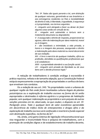 Rev. Trib. Reg. Trab. 3ª Reg., Belo Horizonte, v. 71, n. 111, p. 681-828, jan./jun. 2025806“Art. 5º. Todos são iguais perante a lei, sem distinção de qualquer natureza, garantindo-se aos brasileiros e aos estrangeiros residentes no País a inviolabilidade do direito à vida, à liberdade, à igualdade, à segurança e à propriedade, nos termos seguintes:II - ninguém será obrigado a fazer ou deixar de fazer alguma coisa senão em virtude de lei;III - ninguém será submetido a tortura nem a tratamento desumano ou degradante;V - é assegurado o direito de resposta, proporcional ao agravo, além da indenização por dano material, moral ou à imagem;X - são invioláveis a intimidade, a vida privada, a honra e a imagem das pessoas, assegurado o direito a indenização pelo dano material ou moral decorrente de sua violação;XIII - é livre o exercício de qualquer trabalho, ofício ou profissão, atendidas as qualificações profissionais que a lei estabelecer;XXIII - a propriedade atenderá a sua função social;LIV - ninguém será privado da liberdade ou de seus bens sem o devido processo legal;”A redução de trabalhadores à condição análoga à escravidão é prática repulsiva, nefasta e de tamanha abjeção, que a Constituição Federal estipula expressamente a expropriação de propriedades e confisco de bens que envolvam tais condutas.Eis a redação de seu art. 243: “As propriedades rurais e urbanas de qualquer região do País onde forem localizadas culturas ilegais de plantas psicotrópicas ou a exploração de trabalho escravo na forma da lei serão expropriadas e destinadas à reforma agrária e a programas de habitação popular, sem qualquer indenização ao proprietário e sem prejuízo de outras sanções previstas em lei, observado, no que couber, o disposto no art. 5º. Parágrafo único. Todo e qualquer bem de valor econômico apreendido em decorrência do tráfico ilícito de entorpecentes e drogas afins e da exploração de trabalho escravo será confiscado e reverterá a fundo especial com destinação específica, na forma da lei”.Há, ainda, uma gama extensa de legislação infraconstitucional que visa resguardar a incolumidade física e psíquica de trabalhadores, com a promoção de condições dignas e de estabelecimento de trabalho decente,