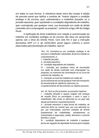 Rev. Trib. Reg. Trab. 3ª Reg., Belo Horizonte, v. 71, n. 111, p. 681-828, jan./jun. 2025807em todas as suas formas. A relevância deste tema deu ensejo à edição de preceito penal que tipifica a conduta de “reduzir alguém a condição análoga à de escravo, quer submetendo-o a trabalhos forçados ou a jornada exaustiva, quer sujeitando-o a condições degradantes de trabalho, quer restringindo, por qualquer meio, sua locomoção em razão de dívida contraída com o empregador ou preposto”, conforme artigo 149 do Código Penal.A tipificação do ilícito trabalhista com relação à caracterização do trabalho em condições análogas ao de escravo não deve ser perquirida apenas sob a ótica do Direito Penal. Com este fim é que a Instrução Normativa MTP n.º 2, de 22/01/2021 prevê alguns critérios a serem observados pela fiscalização do trabalho, veja-se:“Art. 23. Considera-se em condição análoga à de escravo o trabalhador submetido, de forma isolada ou conjuntamente, a:I - trabalho forçado;II - jornada exaustiva;III - condição degradante de trabalho;IV - restrição, por qualquer meio, de locomoção em razão de dívida contraída com empregador ou preposto, no momento da contratação ou no curso do contrato de trabalho; ouV - retenção no local de trabalho em razão de:a) cerceamento do uso de qualquer meio de transporte;b) manutenção de vigilância ostensiva; ouc) apoderamento de documentos ou objetos pessoais.Art. 24. Para os fins previstos no presente Capítulo:I - trabalho forçado é aquele exigido sob ameaça de sanção física ou psicológica e para o qual o trabalhador não tenha se oferecido ou no qual não deseje permanecer espontaneamente;II - jornada exaustiva é toda forma de trabalho, de natureza física ou mental que, por sua extensão ou por sua intensidade, acarrete violação de direito fundamental do trabalhador, notadamente os relacionados à segurança, saúde, descanso e convívio familiar e social;III - condição degradante de trabalho é qualquer forma de negação da dignidade humana pela violação