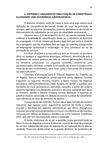 81Rev. Trib. Reg. Trab. 3ª Reg., Belo Horizonte, v. 71, n. 111, p. 61-94, jan./jun. 20256. CRITÉRIOS E ARGUMENTOS PARA FIXAÇÃO DA COMPETÊNCIA: ELUCIDANDO UMA DIVERGÊNCIA JURISPRUDENCIALO diploma celetário cuida de trazer à tona uma viga mestra para definição da competência territorial, focada no local de prestação de serviços, sem se esquecer de exceções próprias, pensadas na demanda de deslocamento do trabalhador ou em prol da mobilidade empresarial.Ao passo que o § 1º do artigo 651 da CLT, no caso do viajante, busca enfatizar a localidade de subordinação direta ou a referência de domicílio do empregado, o § 3º do mesmo parâmetro legal tem por norte a situação do empregador que faz atividades fora do lugar do contrato, assegurando ao empregado apresentar a reclamação no foro contratual ou no da prestação de serviços.Em duas direções a jurisprudência tem se firmado: na primeira ótica se destaca o argumento estanque, inflexível, densificado sob o parâmetro de ordem pública, ao não se admitir pontuações diversas na temática processual; na segunda vertente, constrói-se uma parametrização maleável, voltada à concepção do acesso à justiça como mola de direito fundamental, para fazer valer o horizonte de proteção ao hipossuficiente.Trazendo a discussão para o Tribunal Regional do Trabalho da 3ª Região, nota-se divergência jurisprudencial entre algumas Turmas. Enquanto as Segunda, Terceira, Quarta e Nona Turmas do Regional doméstico, exemplificadamente, estão focadas em definir a questão pelo horizonte do local prestacional, admitidas exceções a partir do próprio desenho legislativo nos parágrafos primeiro e terceiro celetários (art. 651), as Primeira, Quinta e Décima Primeira Turmas destacam a hipótese do patamar flexível, construído em direção ao acesso à justiça do trabalhador, com referência ao local de domicílio do obreiro. O pinçamento das referidas Turmas não é, aqui, tomado de maneira exaustiva, mas apenas como argumentos centrais de modo a melhor elucidar a temática, em abstrato, admitindo-se, por óbvio, divergências inclusive nos próprios entendimentos turmários. As referências são trazidas, inclusive, em reflexo ao dissenso temático na Corte Superior Trabalhista (TST), que não tem harmonização sobre o conteúdo.O modo tradicional de se ver a questão, como parametrizado na Nona Turma do Regional mineiro, é, deveras, a partir do local de prestação de serviço, independentemente do argumento de hipossuficiência laboral, condição financeira desfavorável ou a grande distância do parâmetro de